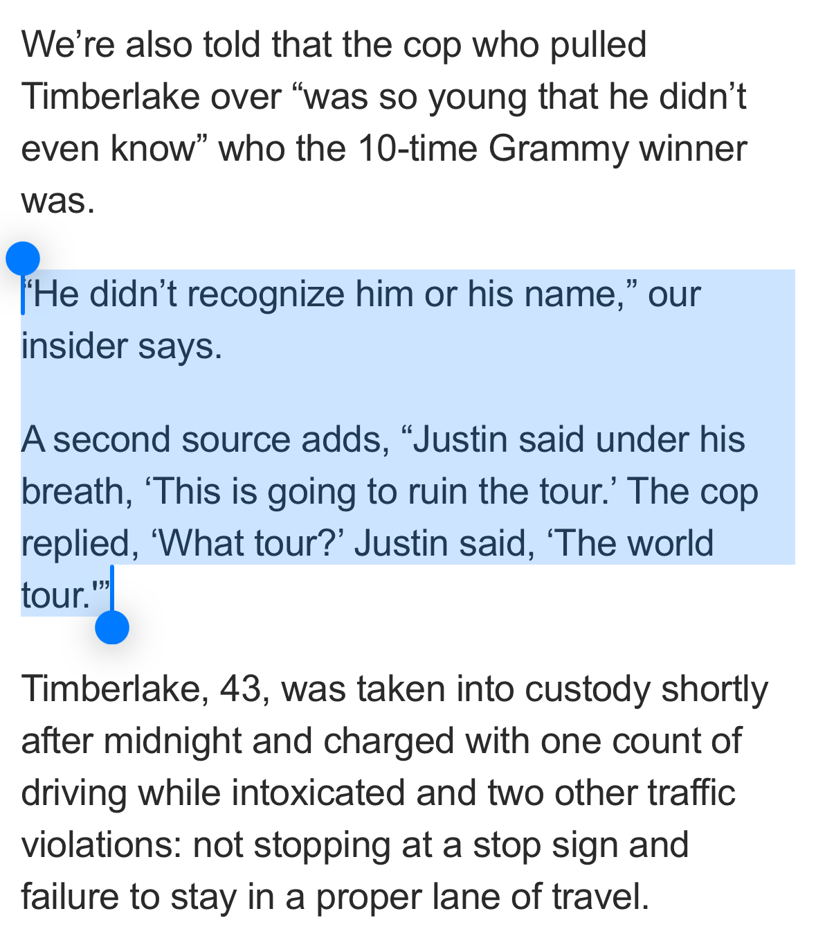 I’m talking about Reese and her “do you know my name” moment because JT has an equivalent. He didn’t necessarily say those words but he implied them. According to Page Six, which is based in NYC so they definitely would have the sources on the inside with law enforcement leaking this kind of information, the arresting officer is so young, they did not know Justin Timberlake. It’s the one time the youth are coming through with their cultural ignorance! This is how a drunk Justin Timberlake attempted to address the officer’s knowledge gap: