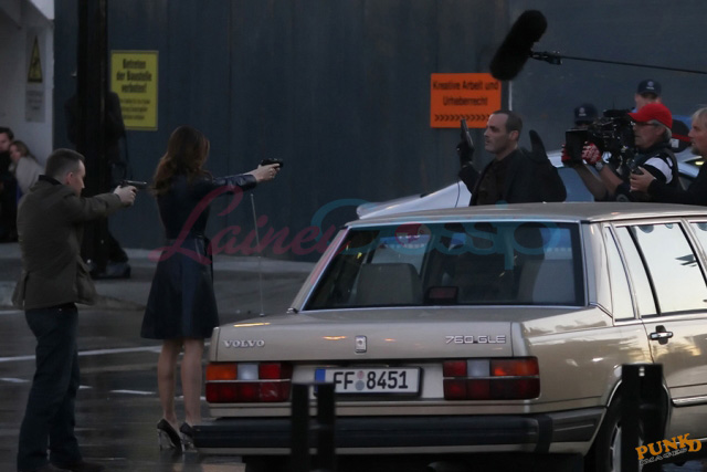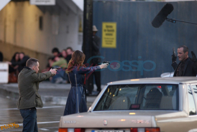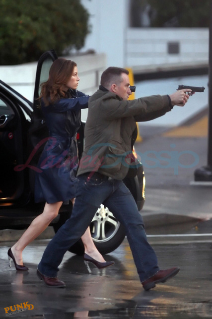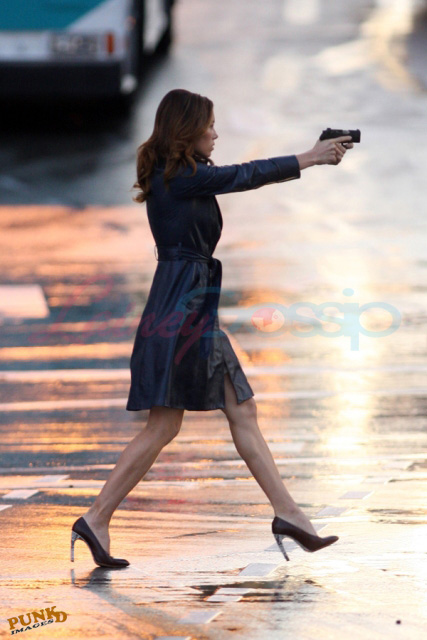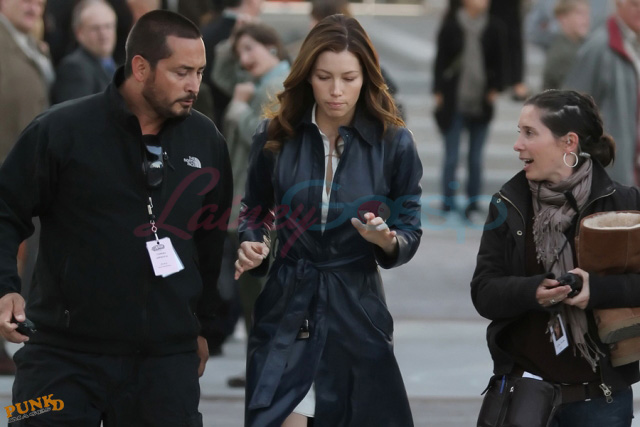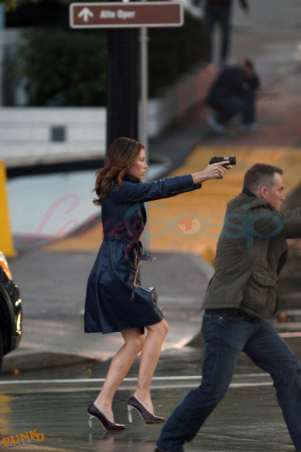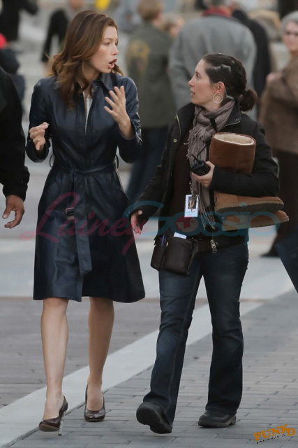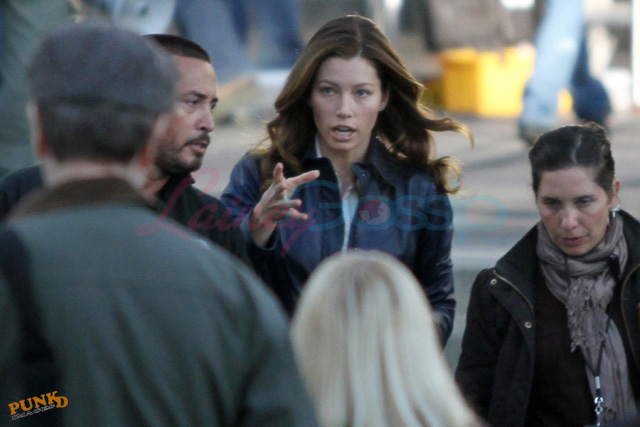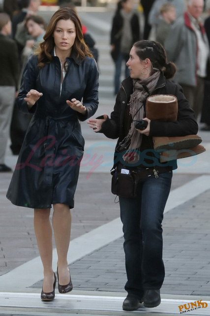 Shelf Ass Jessica Biel is back in Vancouver, arrived last Thursday and spotted yesterday downtown filming A-Team. As you can see, even on set with makeup on, Shelfy looks like sh-t. Gaunt, pale, and am told she seems listless and mopey between scenes. A reader (thanks Rubina!) saw her on Saturday night at a lounge in Kits, shared a few words with her, and also wrote that Biel seemed rough – “awful” was the word that was used.
