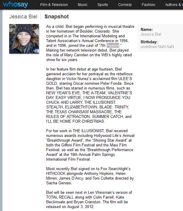 By the way, last week I posted this article about Jessica Biel’s selective career history, emphasising how she omitted 7th Heaven, a tv show on which she starred for 6 years, from her WhoSay profile, choosing instead to focus on her “film” resumé because, like, she is totally a Movie Star, you know?