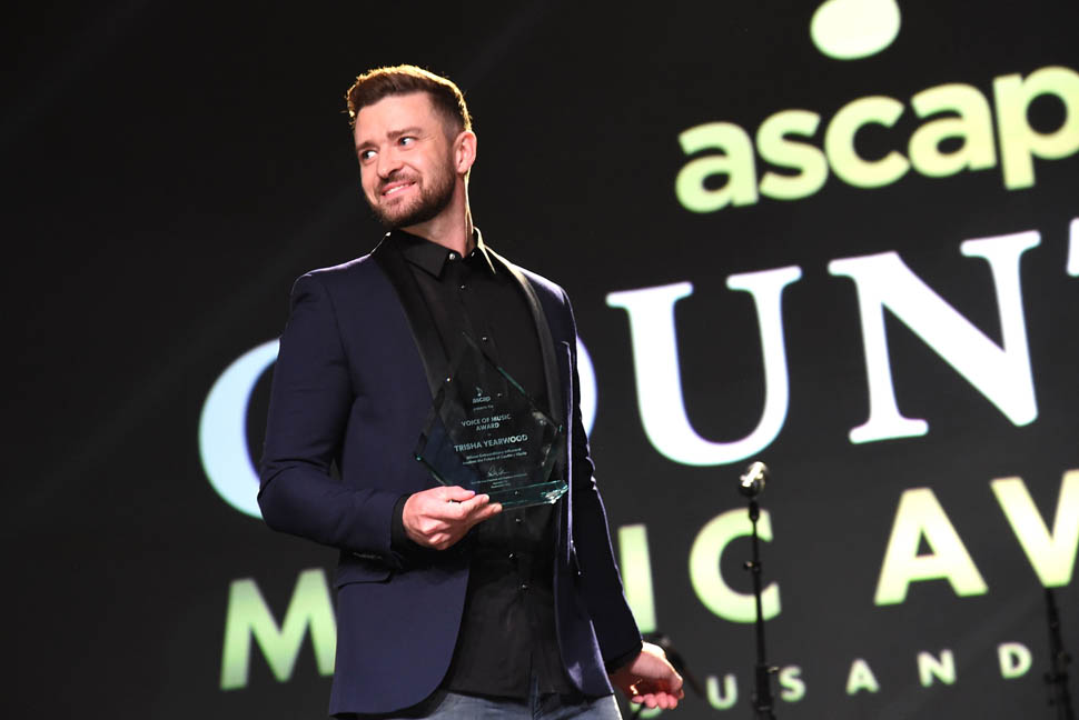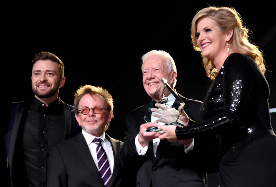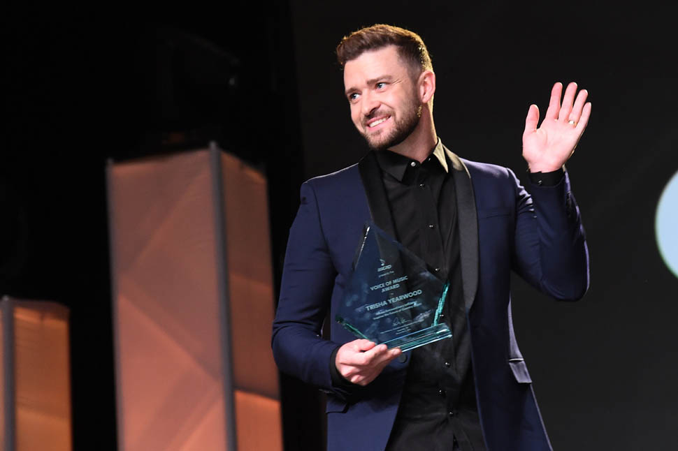 Justin Timberlake showed up at the ASCAP Country Music Awards last night in Nashville to present Trisha Yearwood with the Voice of Music Award alongside former President Jimmy Carter. As a general rule, when you present to someone, do you think you should honour the person and, you know, step the f-ck back and let them be recognised? Or… do you think you should make it as entertaining as possible and therefore become part of the conversation? How would JT answer this question?