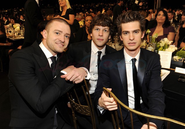 Photo Assumption says Jesse Eisenberg and Andrew Garfield wanted to spend as little time as possible with him. This photo of him, with them at their table, totally cracks me up. Those two are seated together, and Mr Me comes over for a picture, crouches down like a loser clinger, and they can barely hide their disdain. Amazing, right?