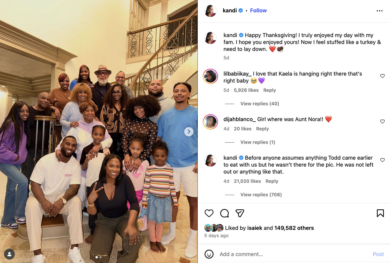 Up until a few days ago, it appeared to be that they were, by all measures, trying to maintain a certain level of respect for one another despite challenging each other on what they each want to see from the divorce. In a recent Thanksgiving recap, Kandi made it clear to her 10 million followers that Todd was not only invited, but came and simply left before the photo was taken.