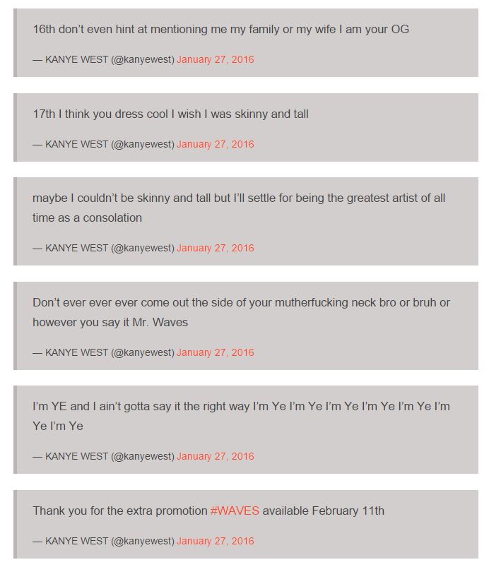 I’m happy that I now know that KK means weed… please excuse the confusion … now back to #WAVES— KANYE WEST (@kanyewest) January 27, 2016