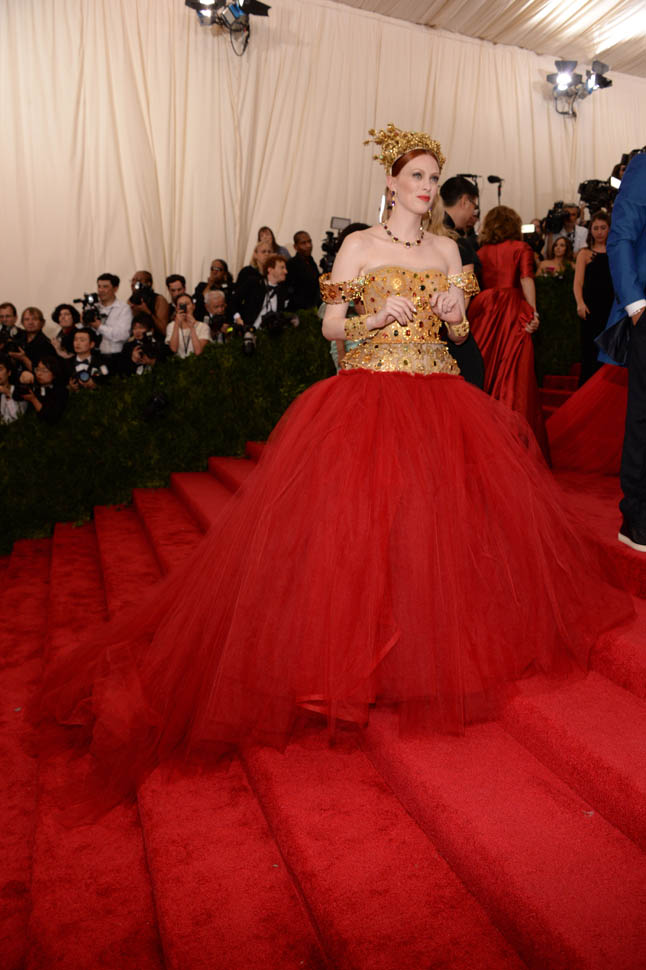 Karen Elson looks awesome, but her night was ruined as soon as SJP hit the carpet, because she became the ‘other’ one in a headpiece. Every dramatic move that Elson made – big red skirt, big gold necklace, who are we kidding, that tiara, which under any other circumstances would have been a showstopper – is in serious ‘what else have you got?’ territory, primarily because with such a wide reaching theme, you have to go pretty far to be the one on the extreme side. Also because of Rihanna, obviously. Karen Elson’s dress shouldn’t be forgettable but it absolutely is.