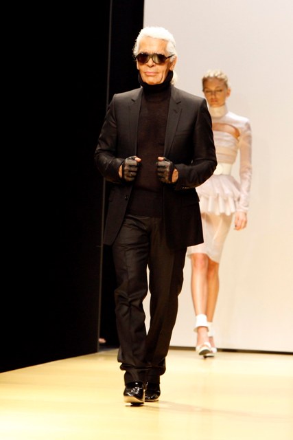 Karl presented Karl Lagerfeld Spring 09 in Paris yesterday and as you can see, he was his usual ridiculous, amazing self on the runway and also seated next to the legendary bitch Anna Wintour.