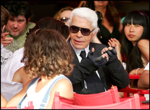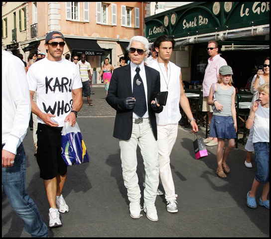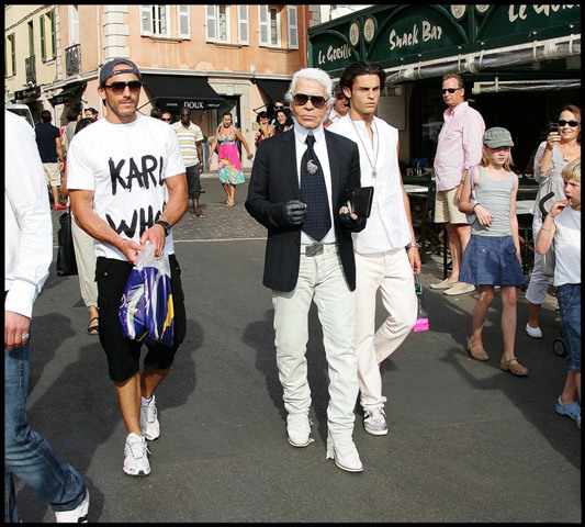 This is Karl the other day in St Tropez. It’s summertime. And he’s wearing long sleeves and those leather gloves. Apparently Karl has not only successful controlled his appetite, he also has blocked his sweat glands.