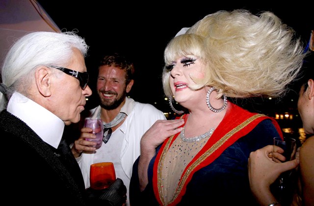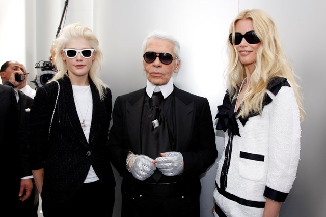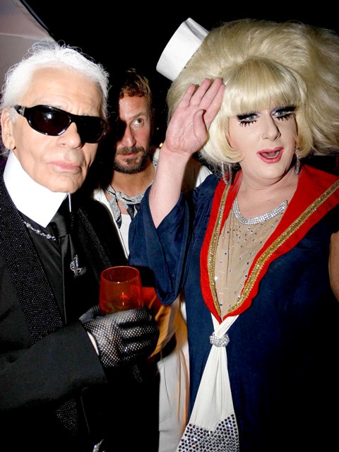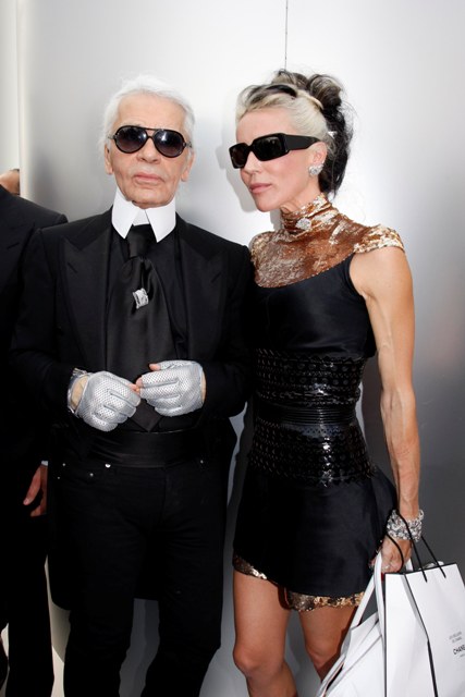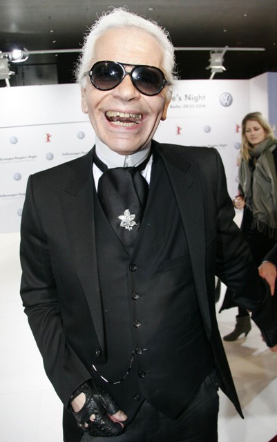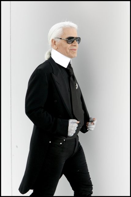 Check out Karl after presenting yet another collection at Chanel yesterday, strutting down the runway with an impressive package tucked into his jeans, posing with models and clients after the show and also at the Lacoste anniversary celebration treating his worshippers to a rare smile, looking like he died five minutes ago.