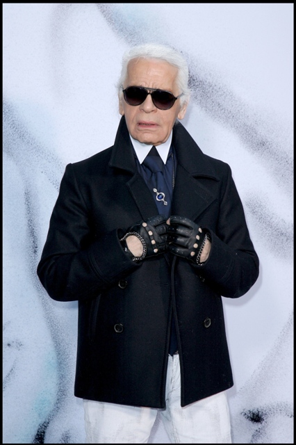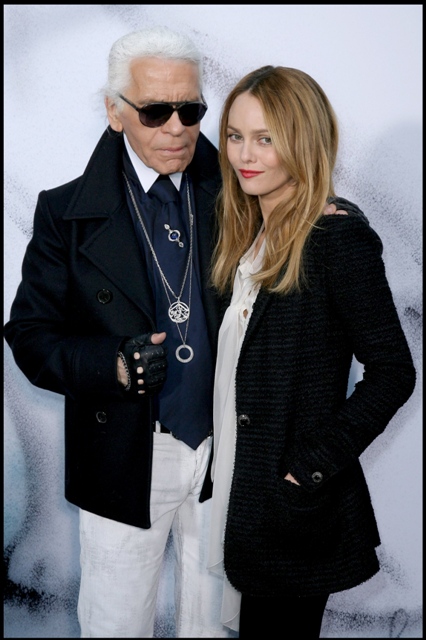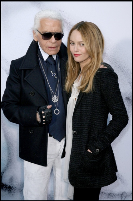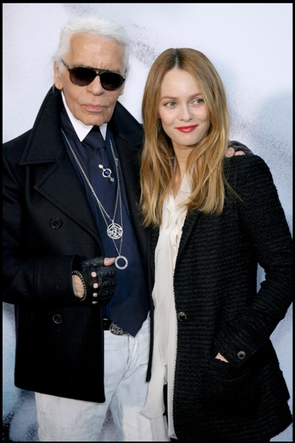 See? It’s 7 pages of this. And these aren’t even the best highlights. Click here but only when you have the time to read the entire article. Don’t allow your time with him to be interrupted. Here’s Karl with Vanessa Paradis at the Chanel presentation for Paris Fashion Week last week.