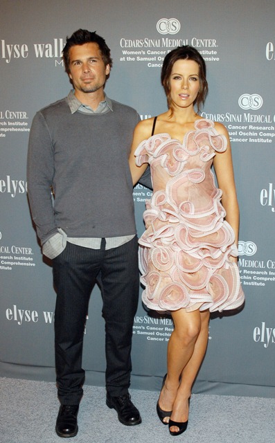 Saturday in Santa Monica, in a hangar at the local airport, check out Kate Beckinsale on the carpet at the Pink Party to benefit Cedars-Sinai Women’s Cancer Research. You would have thought it was a gala, right? One look at her husband will tell you – it was certainly not a gala. Not even close. When the man doesn’t have to tuck in his shirt, why is she overkilling it all the way to the Golden Globes?