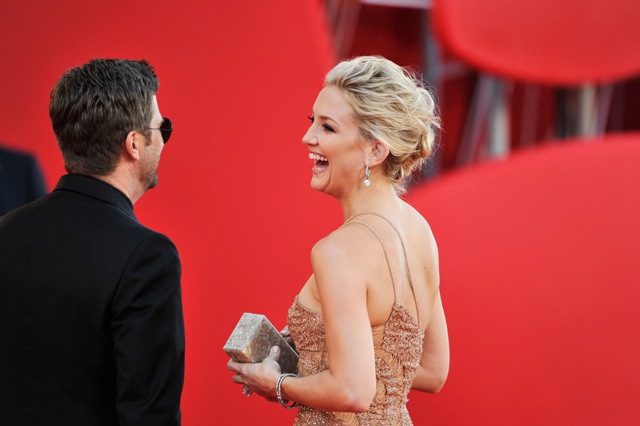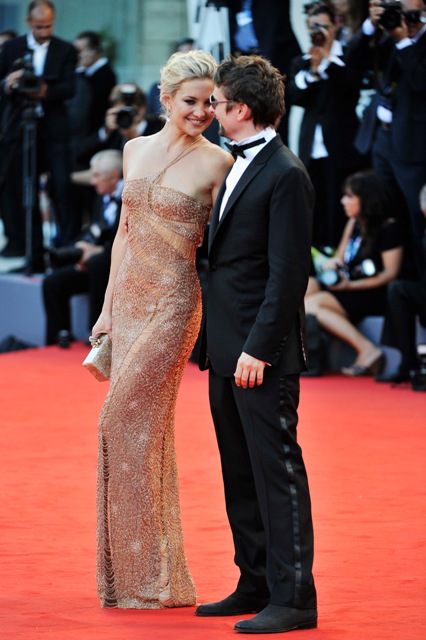 Kate Hudson walked the carpet on opening night of the Venice Film Festival tonight for The Reluctant Fundamentalist. Pretty sure that’s a Versace dress. Click here to see it on the runway, the 15th image. Kate’s wearing both the straps on one side. I like it better that way too. But God those shoes are terrible.