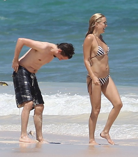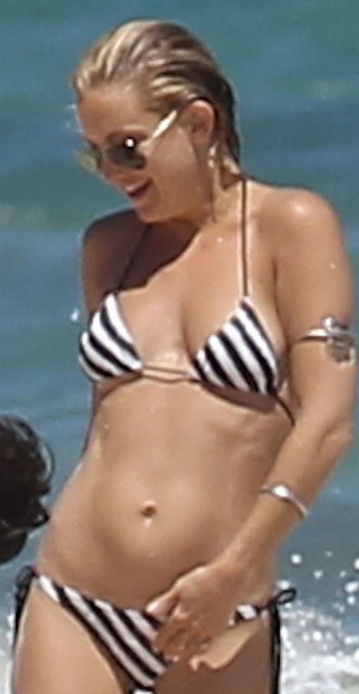 8 months after the birth of Bingham, Kate Hudson is on the beach in Mexico looking like she never had a baby, or two. That is a cuuuute bikini, non? And her breast enhancement was really rather modest. Like, barely noticeable, and only, only, only to piece of sh-t gossip whores who study these things for a living, and even then only when you have the before pictures shoved right up in your face.