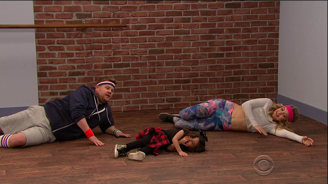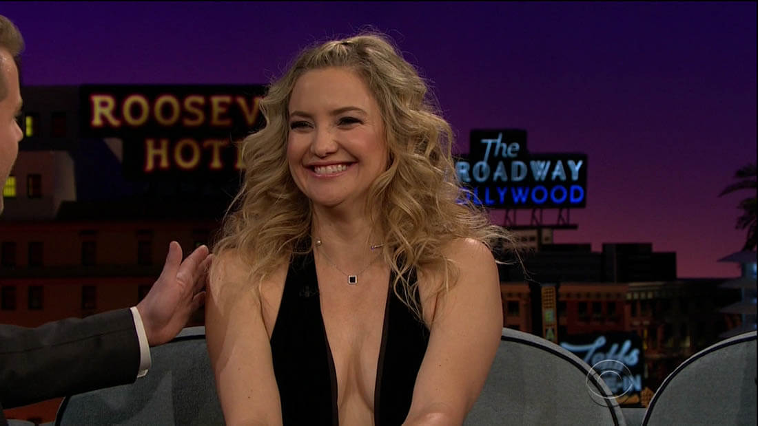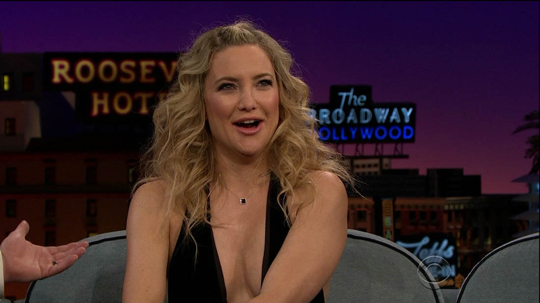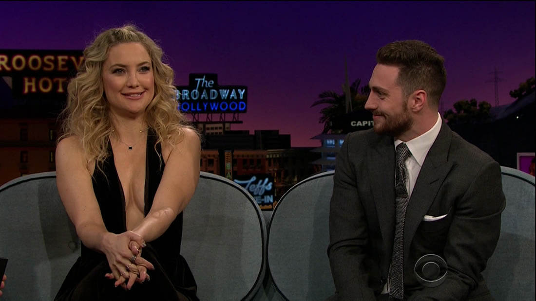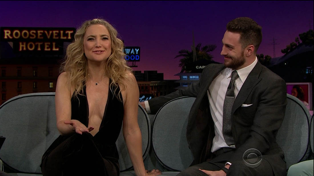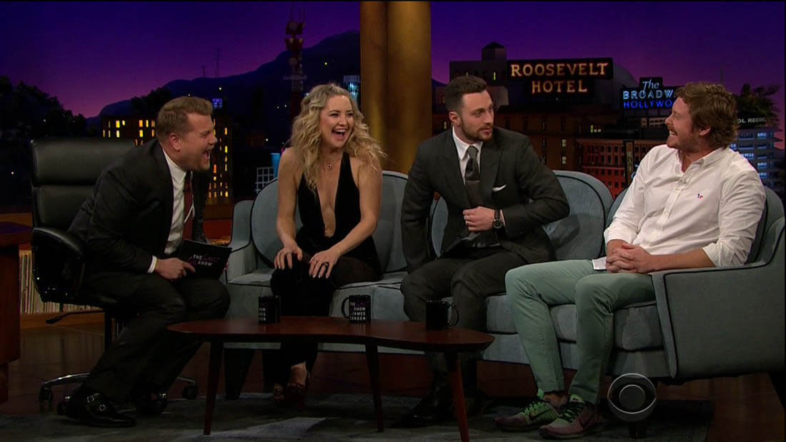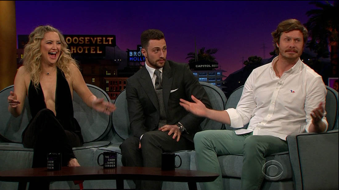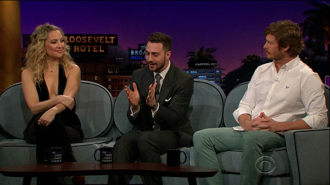 Kate Hudson was on with James Corden last night. Aaron Taylor-Johnson and Anders Holm were the other guests. As far as I know, Kate is not promoting a movie. She seems to be promoting her lifestyle, specifically fitness. I think? Because there was a lot of talk about exercising in this interview and then she shows them her favourite move and they all get down on the floor to do the “clam”. I love how game ATJ is for this.