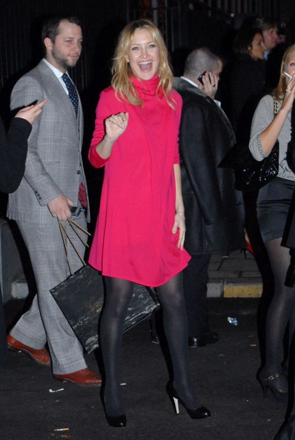 But still… many of you are convinced Kate Hudson is pregnant because she’s been wearing baggy clothes of late, including this number last night at the Madonna Malawi event. According the baby fever fanatics, she also looks a little bloated in the face – supposedly a sure sign.