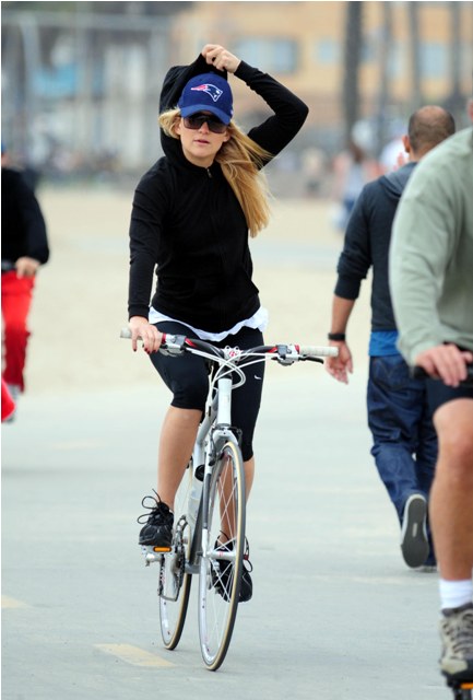 Kate Hudson and her parents Goldie Hawn and Kurt Russell went for a bike ride with boyfriend Matt Bellamy the other day in Santa Monica. Kate as you can see is wearing her New England Patriots cap. She’s a good friend of Mr Kraft.