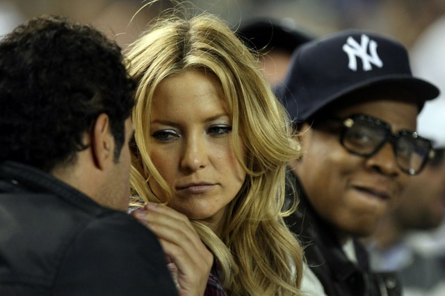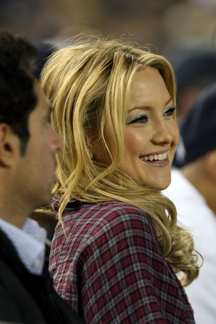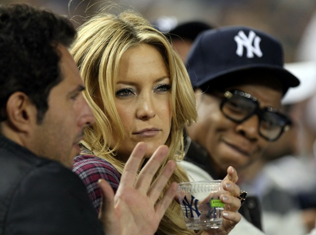It’s on. The American League Division Series is underway, game 1 was last night with the Yankees taking it 7 – 2 over the Twins as New York is favoured, predicted to meet up with the Phillies in the Fall Classic. Kate Hudson was in the stands to cheer on her man, seated beside Jay-Z and Guy Oseary, happy, glowing, and cheering…