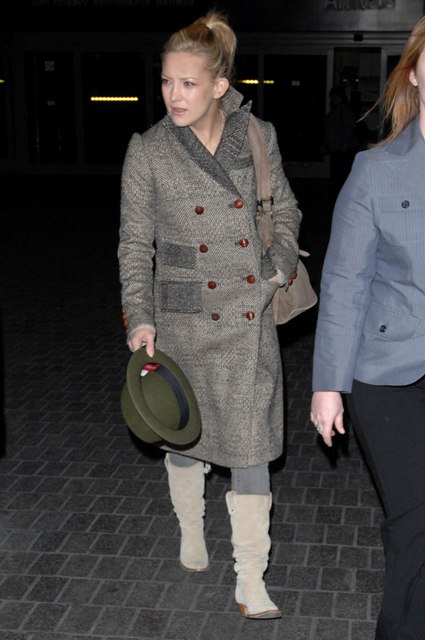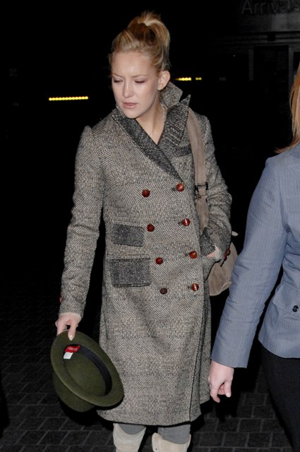 So here’s Kate Hudson in LA yesterday, bundled up in a tweed coat and boots, holding but not wearing (at least not on camera) a stylish green hat. She’s not dating anyone right now but still…