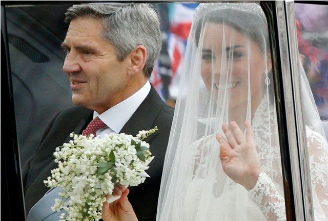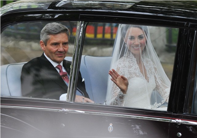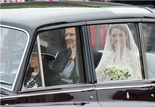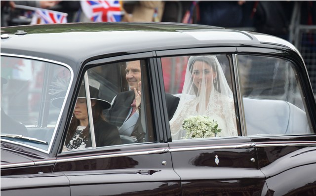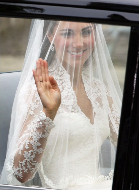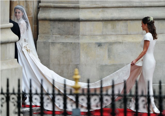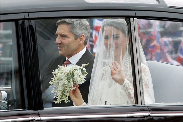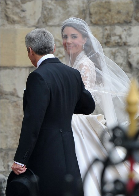 The veil is made of layers of soft, ivory silk tulle with a trim of hand-embroidered flowers, which was embroidered by the Royal School of Needlework. The veil is held in place by a Cartier ‘halo’ tiara, lent to Miss Middleton by The Queen. The ‘halo’ tiara was made by Cartier in 1936 and was purchased by The Duke of York (later King George VI) for his Duchess (later Queen Elizabeth The Queen Mother) three weeks before he succeeded his brother as King. The tiara was presented to Princess Elizabeth (now The Queen) by her mother on the occasion of her 18th birthday.