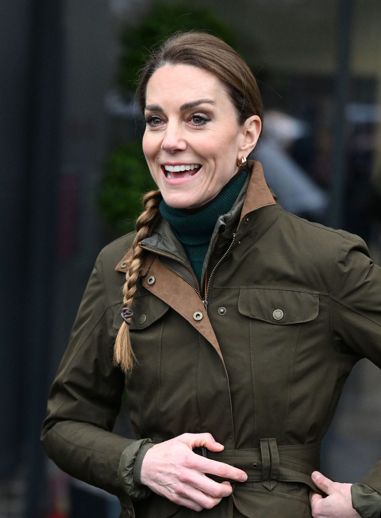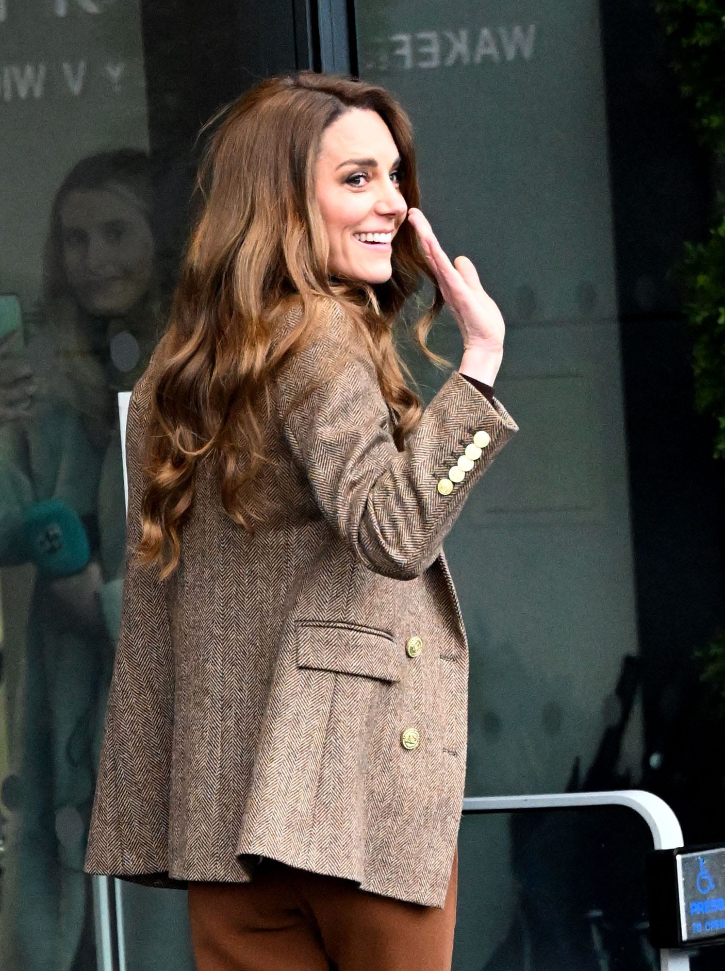 Today’s style moment, however, is legitimately newsworthy because it’s rare, to do with her hair. If you’ve been reading this site for a while, you’re probably familiar with how I feel about Kate’s hair taste – which is that it’s dated and boring. That was the case earlier in the day when she stepped out at Wakefield Trinity Stadium in a wool blazer over brown trousers with hair side parted and curled at the ends.