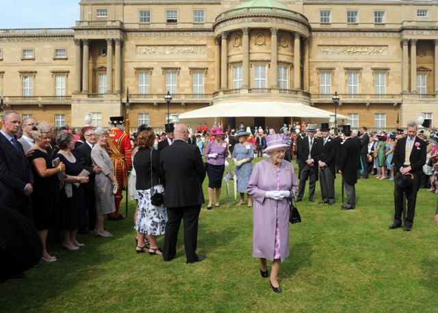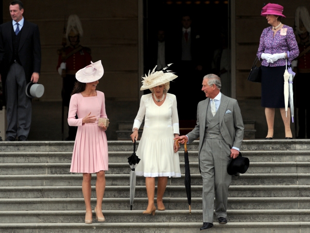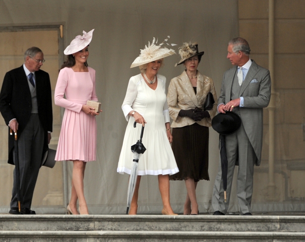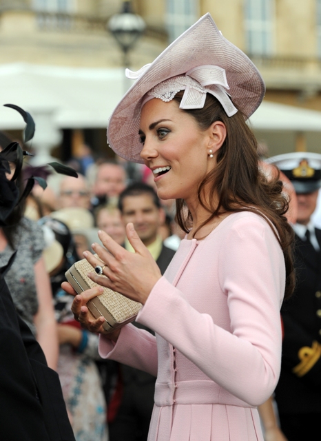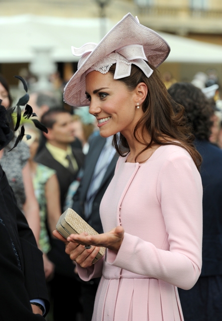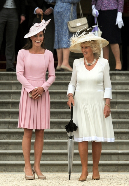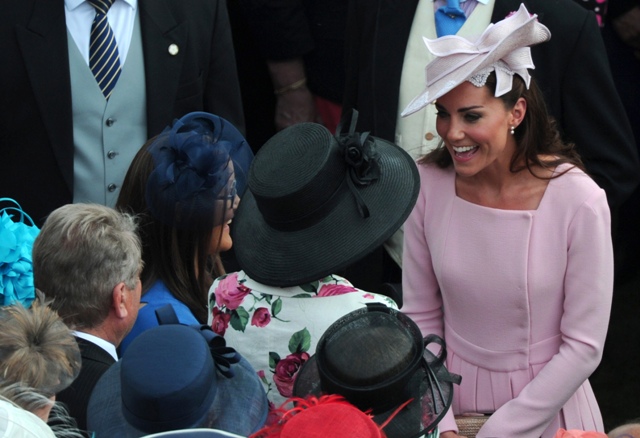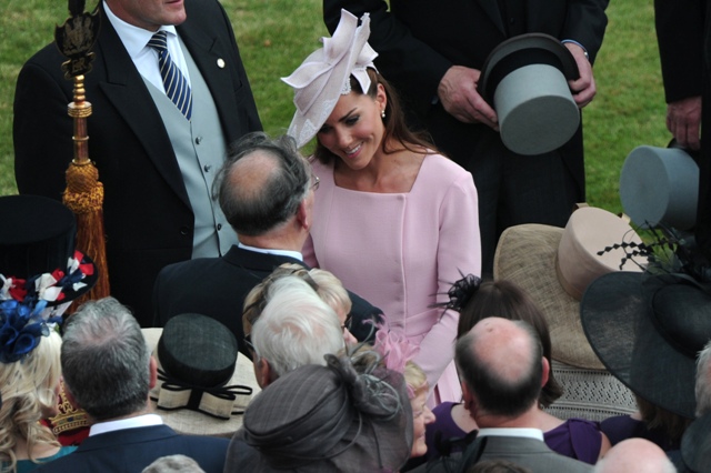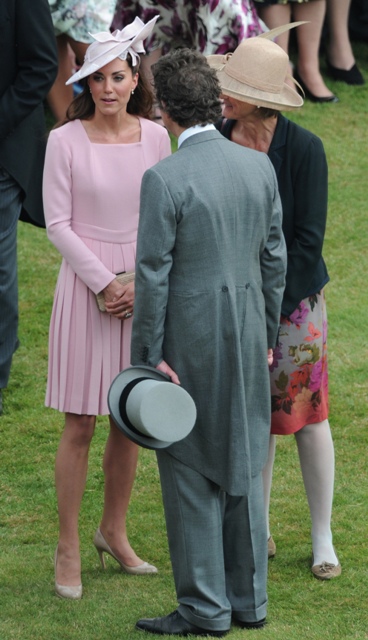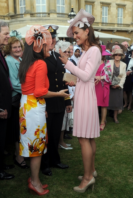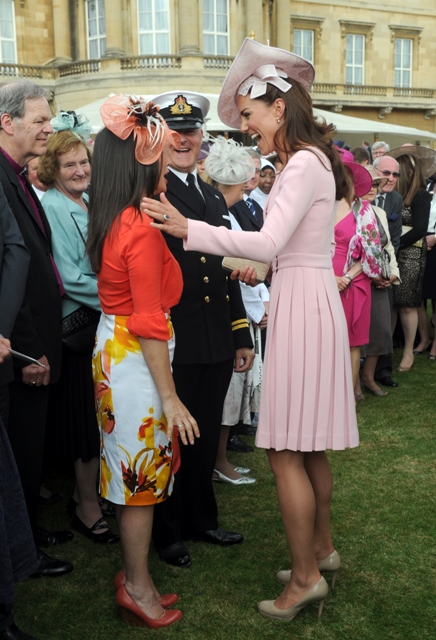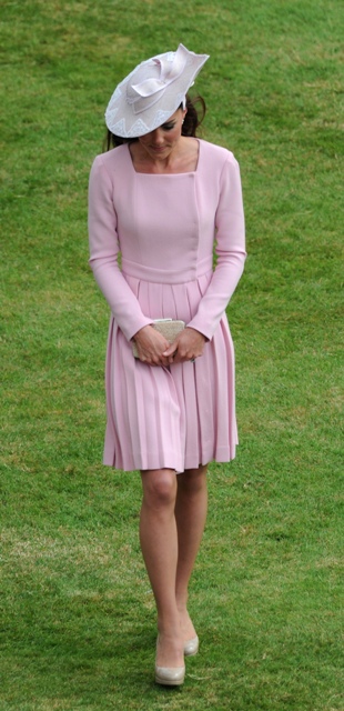 Ten days ago, Queen Elizabeth hosted a reception for world royalty at Windsor Castle. Princess Catherine wore a pink dress with a pleated skirt. Click here to see. The Queen’s annual garden party happened today at Buckingham Palace. And Kate wore the same dress. That is the same dress, right?