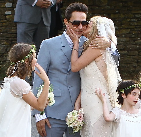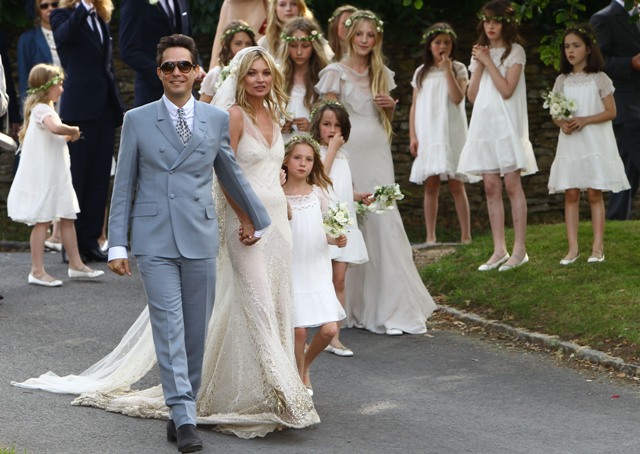 As previously reported, John Galliano designed her gown. I wish I could tell you it was sh-tty because what he did was so sh-tty but the dress, to me it’s not sh-tty. It is, to me, exquisite. And perfectly suited to the bride Kate Moss, perfectly her own steeze. Totally new, but also with a vintage vibe. I love the V detail around the neck and chest. I love that it’s sheer right around her crotch – of course it is, with nipples too – and how it appears as though gold dust has cascaded down her body to settle among the feathers on the bottom.