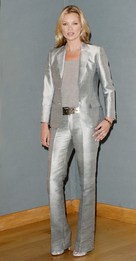 Kate was at Christie’s today to support…herself. This is a badass silver suit. I am however disappointed in her choice of shoe. I feel like Kate Moss is better than that shoe.