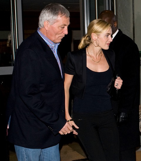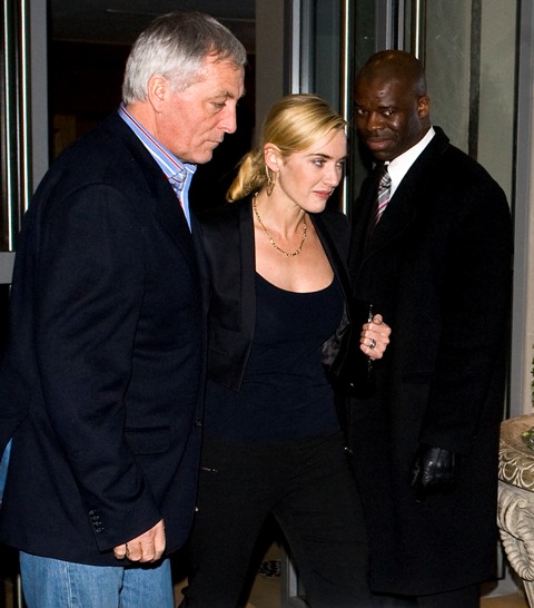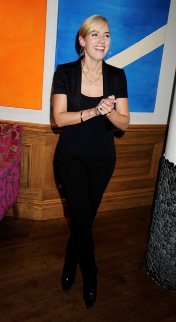 Kate Winslet in London yesterday at a private screening of The Reader for which she just received a Best Supporting Actress Golden Globe nomination. As opposed to the overbronzed overblonde Hollywood divorcee clone Kate from last week, this is the Kate I know and love. The one Halle Berry said is always naked sitting on a toilet in a movie. It was a compliment.