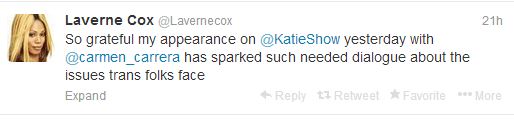 Obviously, the final word on this should come from Laverne and Carmen. If you check out their Twitter accounts, there’s nothing but love for Katie and excitement at the opportunity to elevate the discussion about the lives of transgender people.