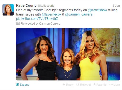 Earlier this week, TV’s two most famous transgender female entertainers, Laverne Cox from Orange is the New Black and Carmen Carrera from Rupaul’s Drag Race, were on Katie Couric’s show. They had, or at least I thought they had, a productive conversation about their projects and their experiences as trans women. Today, however, people across the internet are coming for Katie, accusing her of bringing up subjects that were too invasive and posing questions that are not cool to ask trans people.