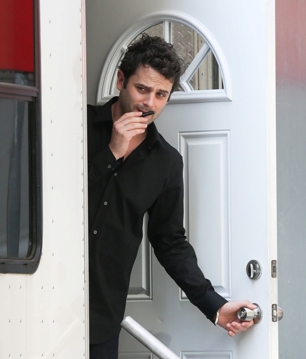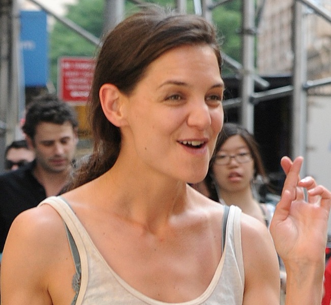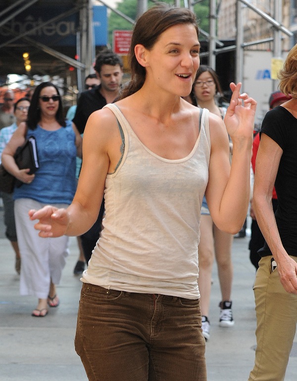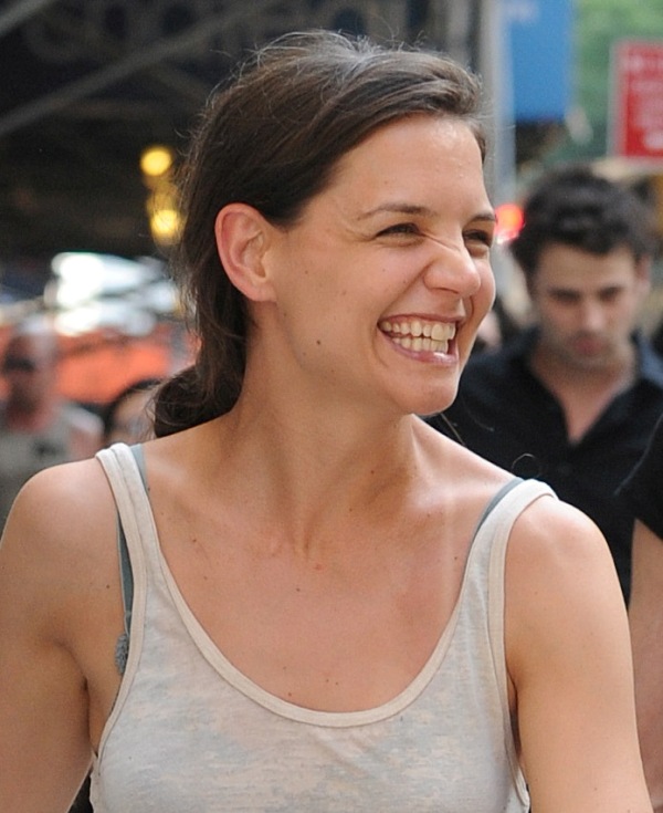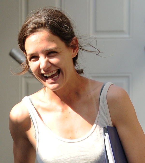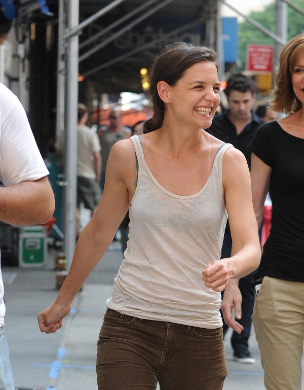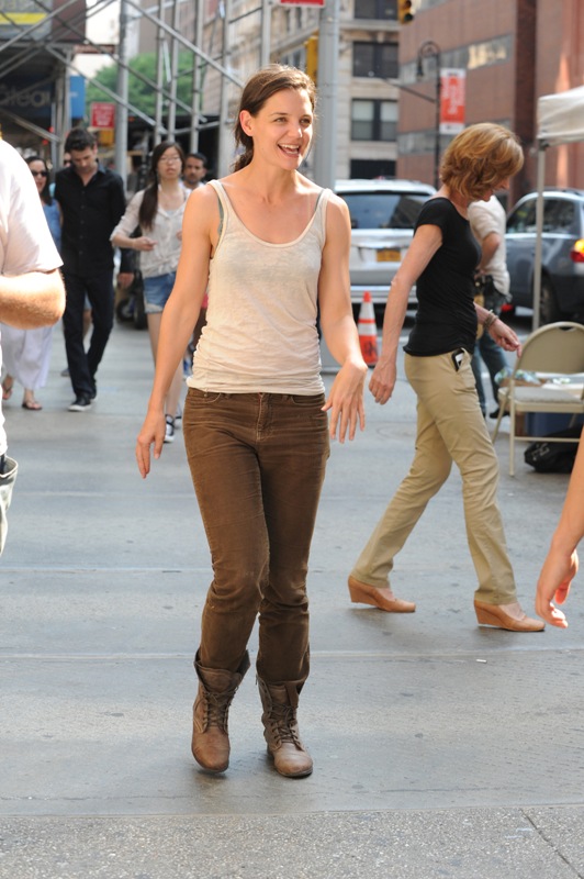 Katie Holmes looked very cheerful yesterday on the set of Mania Days in New York as rumours continue to build that her relationship with co-star Luke Kirby has become romantic. The two have been spending time together off-set, after work. According to the NY Daily News, they went out for dinner last week and were walking together closely afterwards but when she noticed that the paps were around, she quickly jumped in a cab and took off. She also doesn’t use the front entrance of her apartment anymore. This only started a few weeks ago. Prior to that, she had no problem entering and exiting the building from the main doors, even if photographers were waiting outside for her.