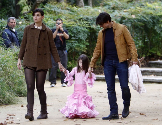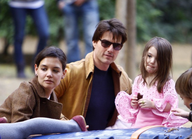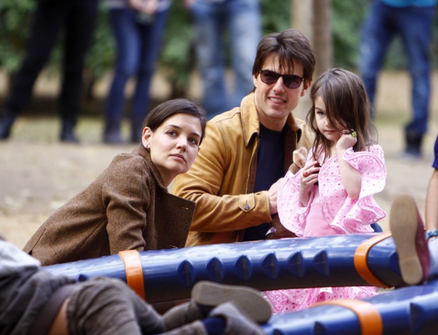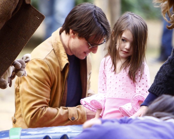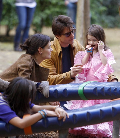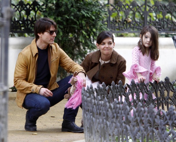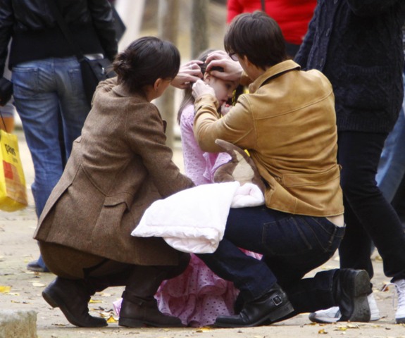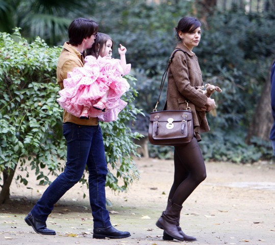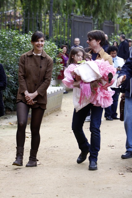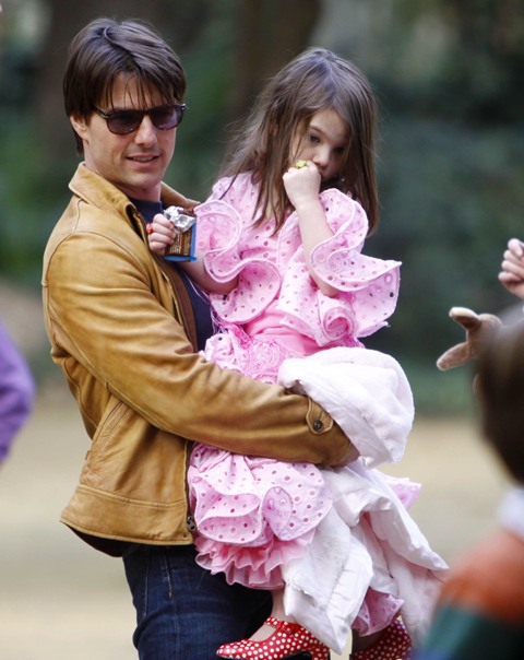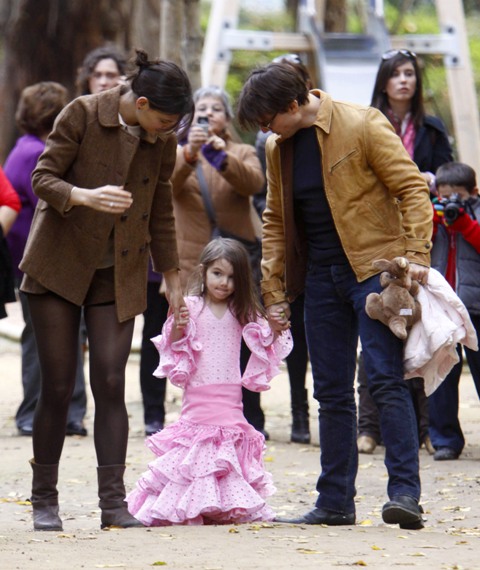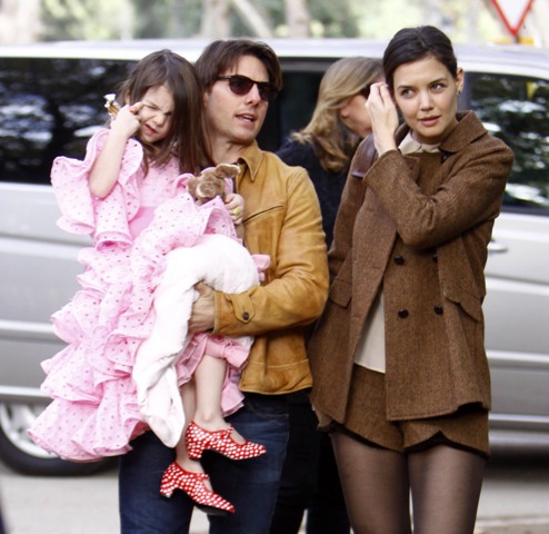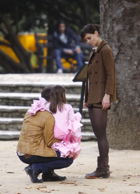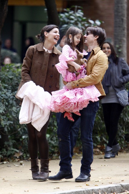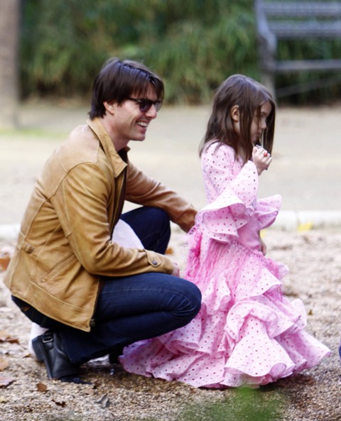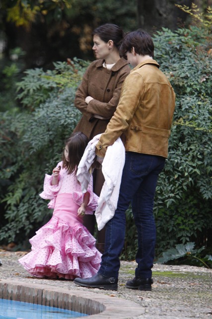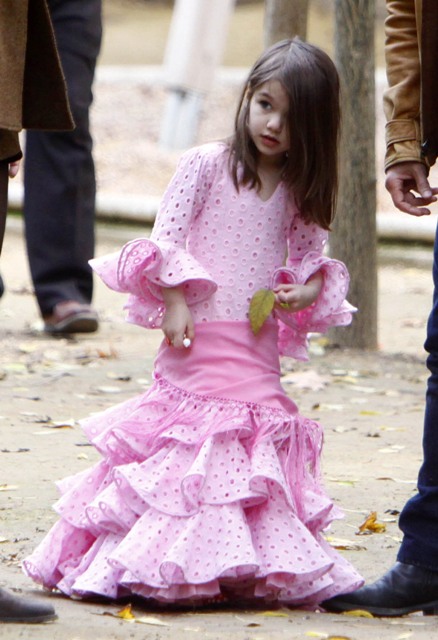 Little Sci loves dressing up in pretty frilly things. Just like Daddy? Little Sci’s advantage is that she gets to do this in public. She and Katie Holmes flew to Sevilla, Spain this weekend to spend time with Tom who’s been busy shooting Knight & Day with Cameron Diaz.