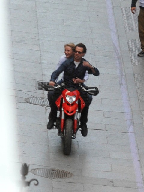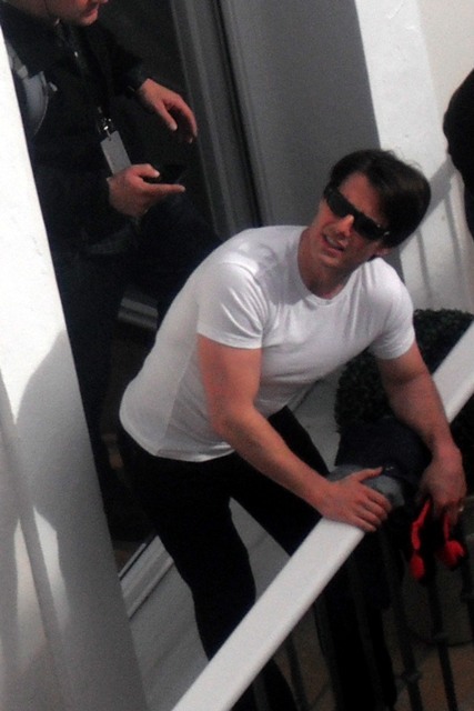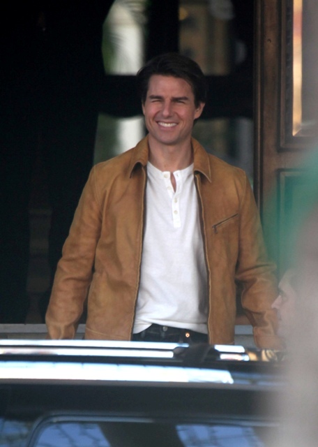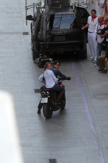 Tom Cruise is off in Europe having the time of his life shooting Knight & Day with Cameron Diaz, riding around on a motorcycle all manly man, waving at his public, grinning widely at the crowds gathering around the set.