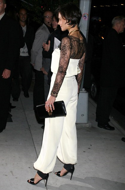 Then again, on Broadway for All My Sons, Katie stepped out in a black onesie covered by a white staples harem pant jumpsuit – cheap material that sagged at the bust, a gaping hole at the back, and an extremely unflattering Gumby gap between her crotch and her waist…