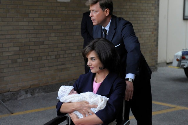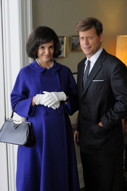 Did you watch The Kennedys on History Television last night (in Canada)? I'm attaching a few more stills from the series. Like I said - the critics might not be into it from, you know, a writing and development standpoint, but as a gossip lover, as a body language lover, you cannot help but get into it when she's trying to play off the veterans. Or speaking. Listening to her butcher that accent is making my life. Also, Barry Pepper. And the clothes! Photos attached.