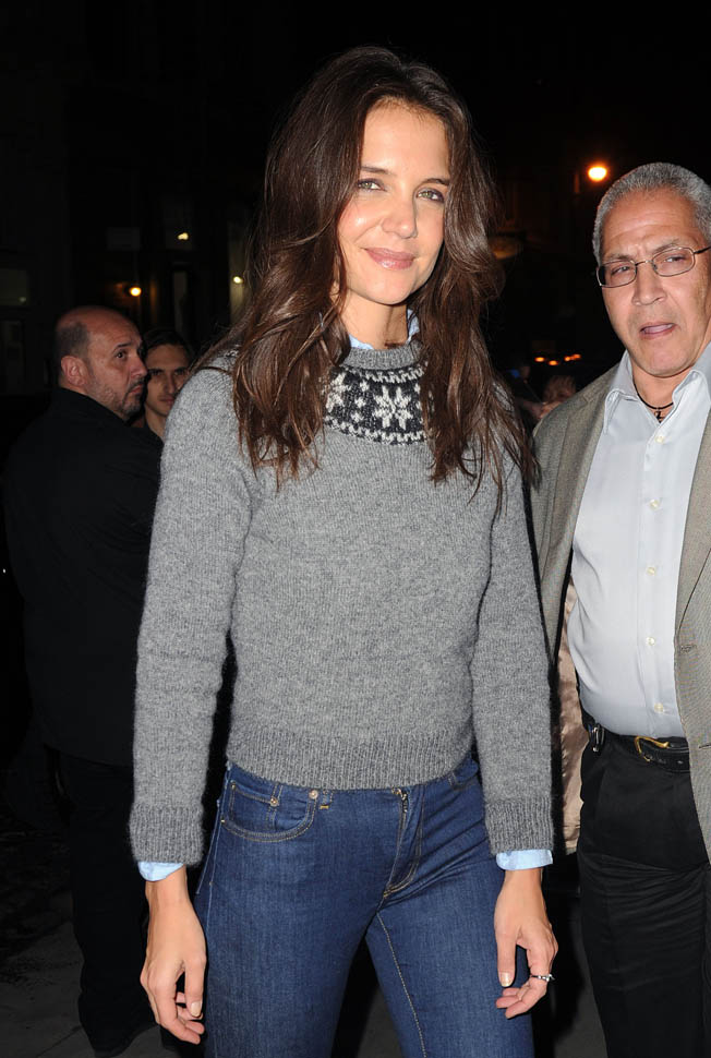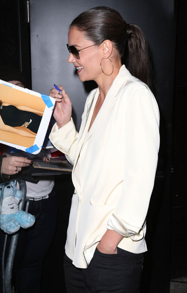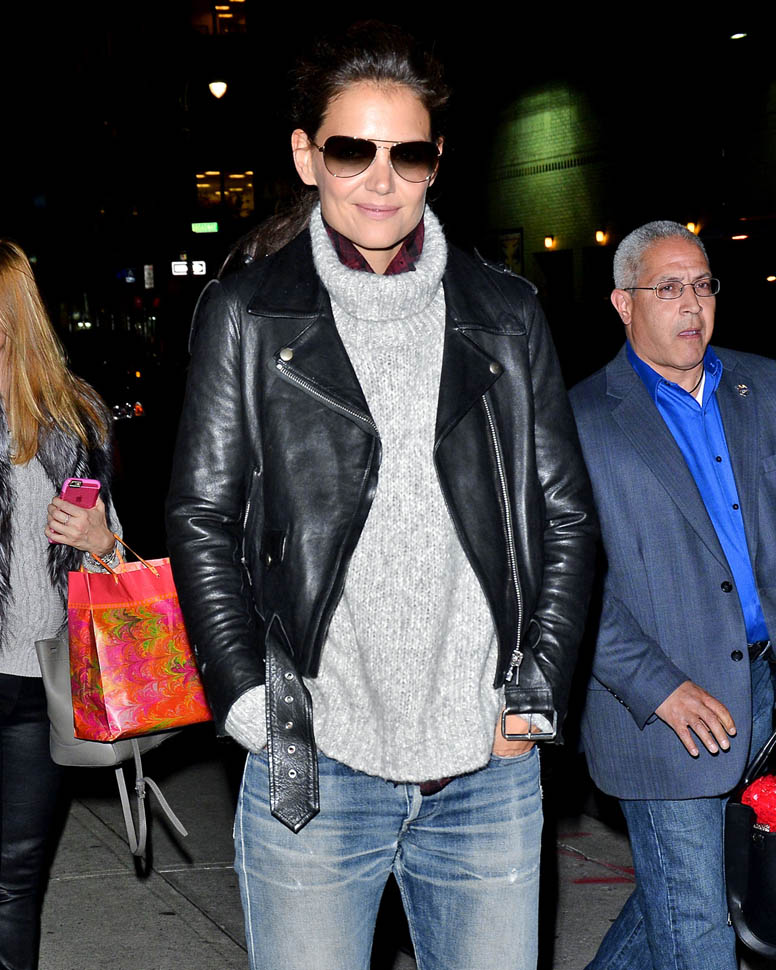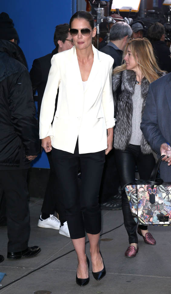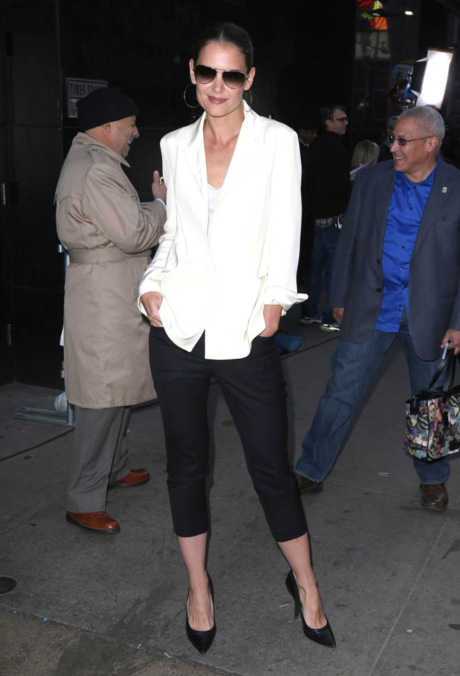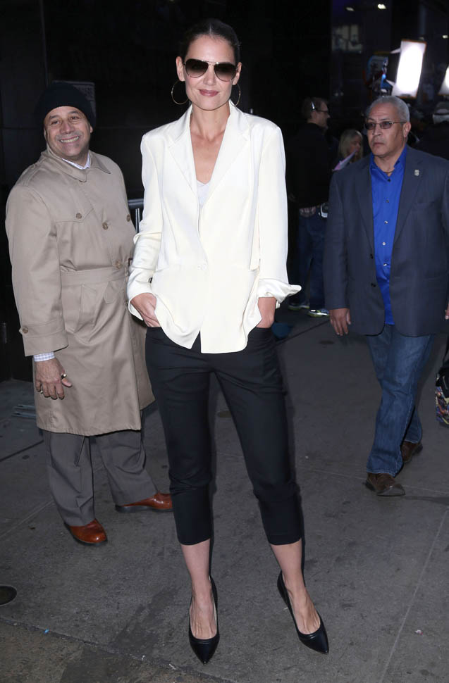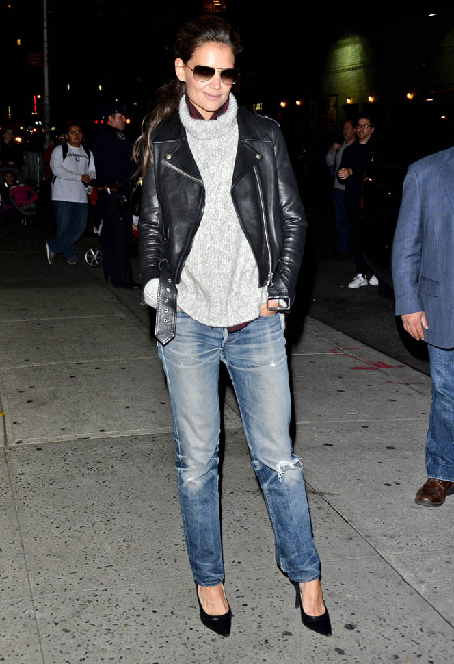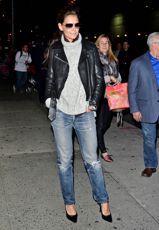 Katie’s been on the talk show circuit in New York. The outfits are cute. A pair of short pants under a white blazer for Good Morning America. Great leather jacket and jeans arriving at Letterman. Another pair of jeans over red booties at the Apple store last night.
