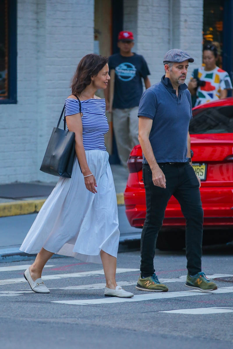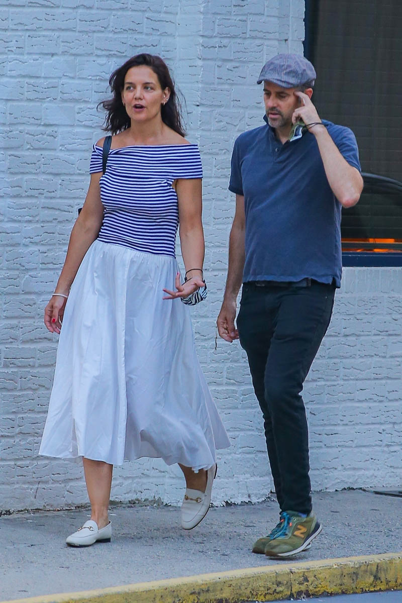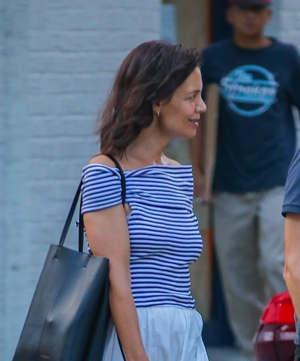It’s not that off-the-shoulder has ever not been a summer look, but maybe it’s just me – this summer it seems like there’s even more off-the-shoulder than usual, at least where I live. Here’s Katie Holmes out in New York yesterday in a blue and white striped off-the-shoulder top with a white long skirt and loafers, yacht style on the street. Katie was apparently heading out for dinner with a friend.