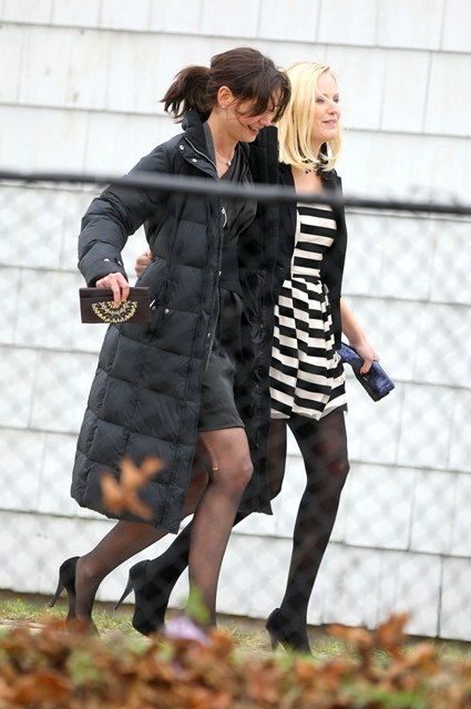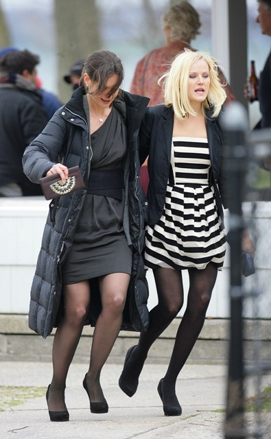 Here she is on the set of The Romantics the other day with a tear in her stocking looking like she’s having a good time with Malin Ackerman. When he’s away she’s allowed to remember what it’s like being around other people. Looks good on her.