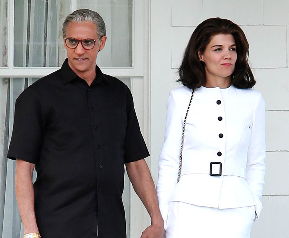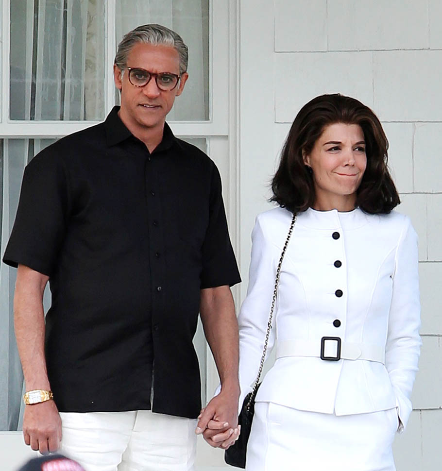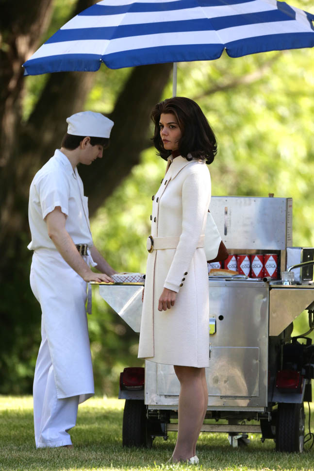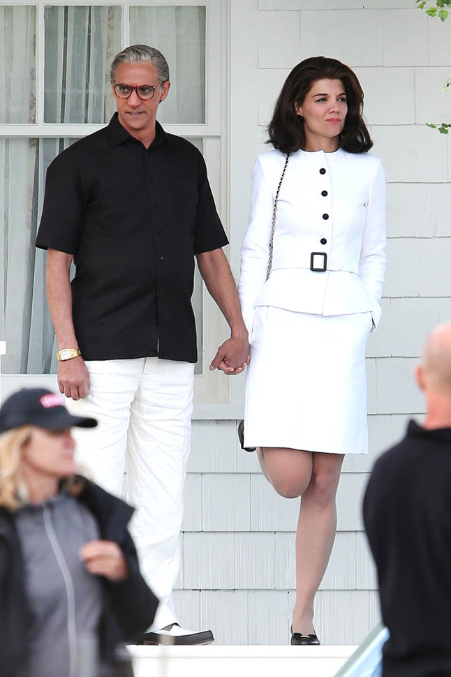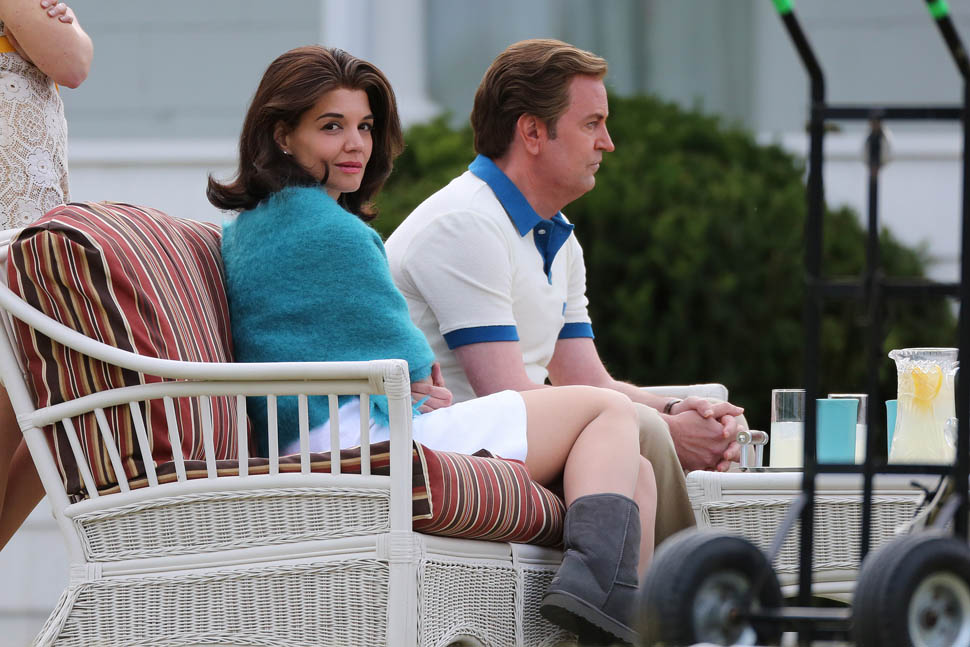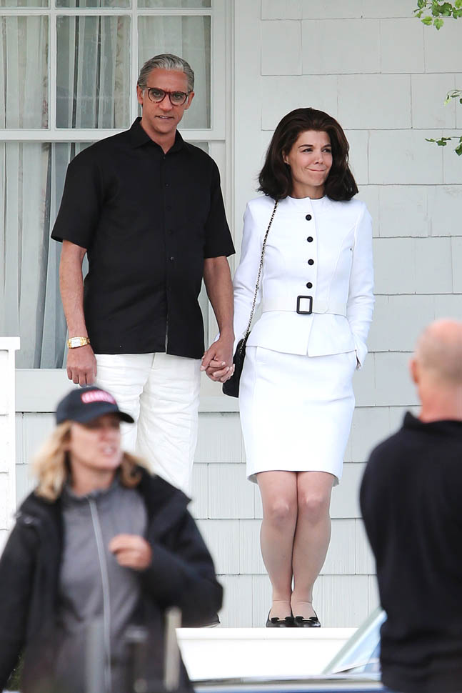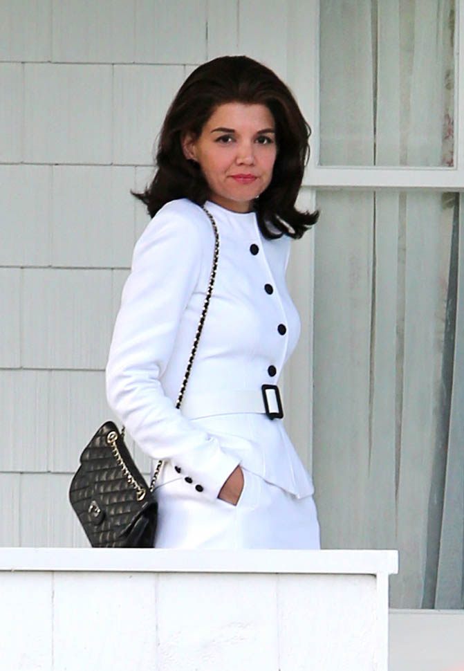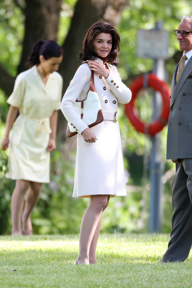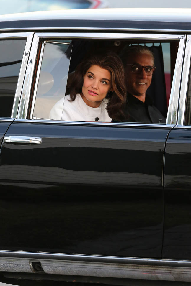 Katie Holmes is in Toronto shooting The Kennedys After Camelot. She was seen on set yesterday with Matthew Perry who is playing Ted Kennedy. Katie, of course, is Jacqueline Kennedy …soon to be Onassis? She was also photographed in character with an obvious Aristotle (Alexander Siddig, or Doran Martell to the rest of us). I appreciate that they’ve dedicated enough of the budget to Katie’s styling. The hair and the wardrobe are unmistakable.