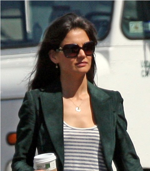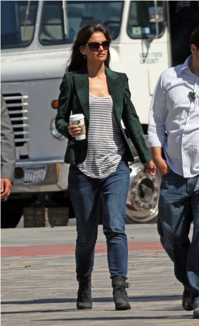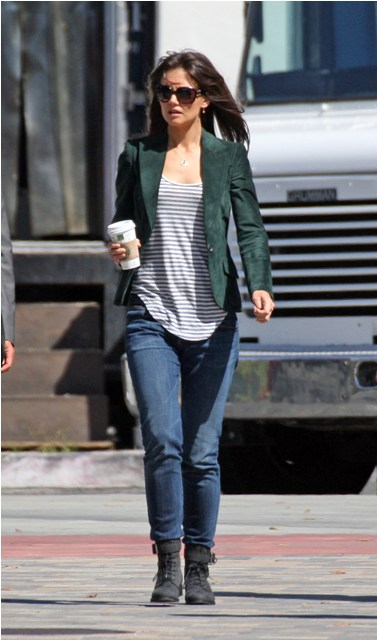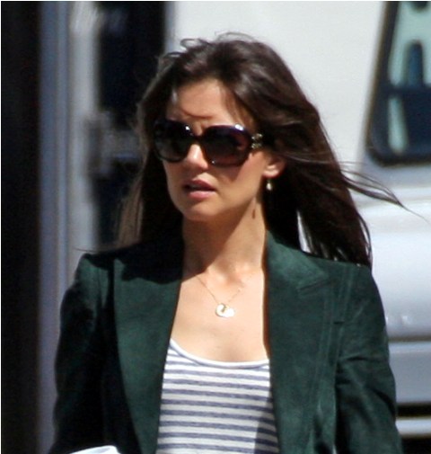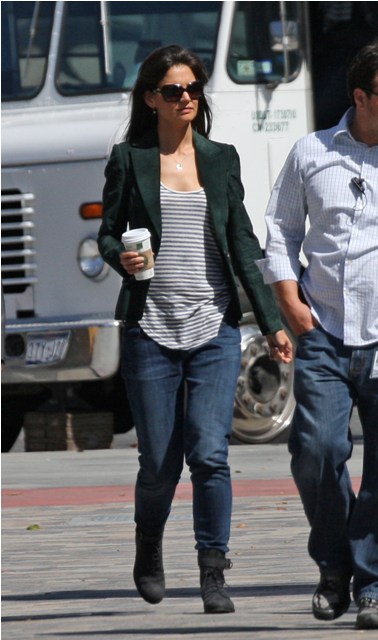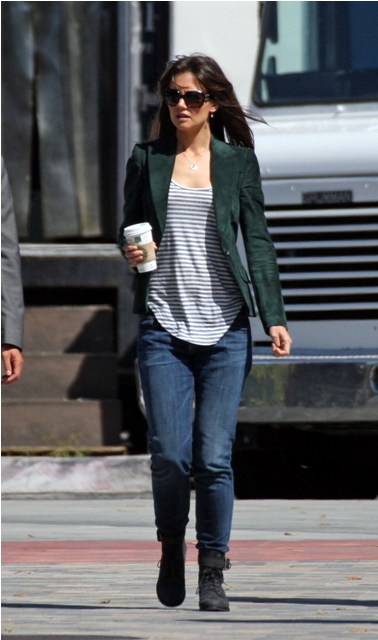 While her husband keeps taking his shirt off in Prague on the set of MI:4, Katie Holmes is back in Los Angeles shooting a movie of her own. Here she is today heading to work on Jack & Jill, in which she plays the wife of Jack, Adam Sandler, who has a twin sister, Jill, who is f-cked, and she comes to stay, and hilarity and drama ensue.