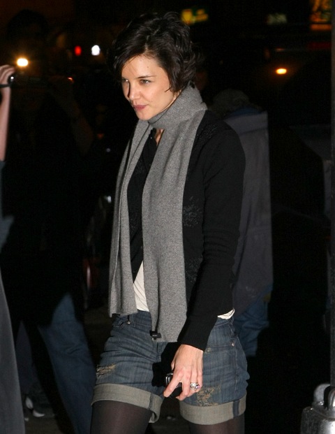 Check out Katie Holmes leaving her apartment yesterday headed to work on Broadway. As you can see, she’s trying out a new trend, not unlike the whole boyfriend jeans thing from earlier this year which, for many of you, became a hot thing.
