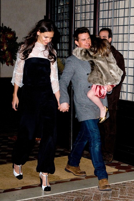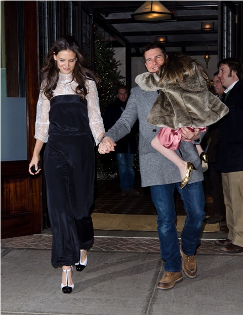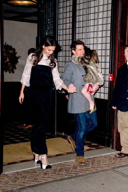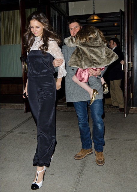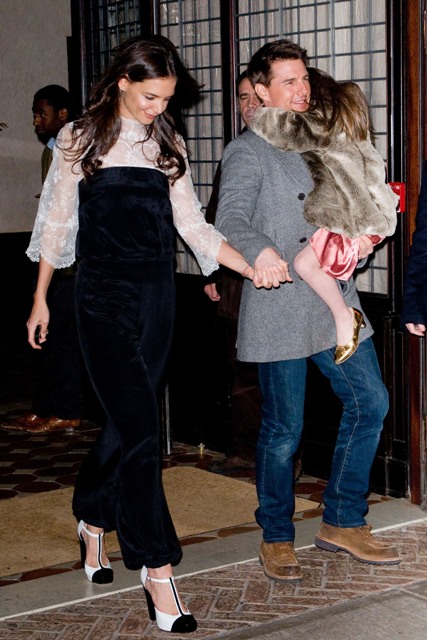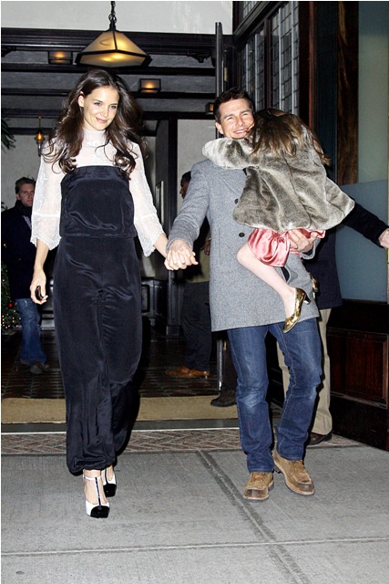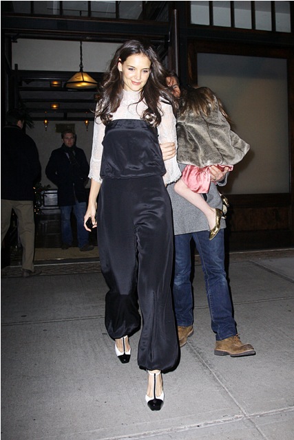 Katie spent her birthday with Little and Littler Sci in New York in a birthday jumpsuit. On Charlize Theron, or Rihanna? Totally? The problem with how Katie wears hers is that even if she didn’t design it, it LOOKS like she did design it. You are all, I’m sure, well aware of what happens when Katie designs her own clothes. In this case it’s like she zapped Suri’s playclothes to adult size.