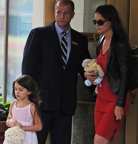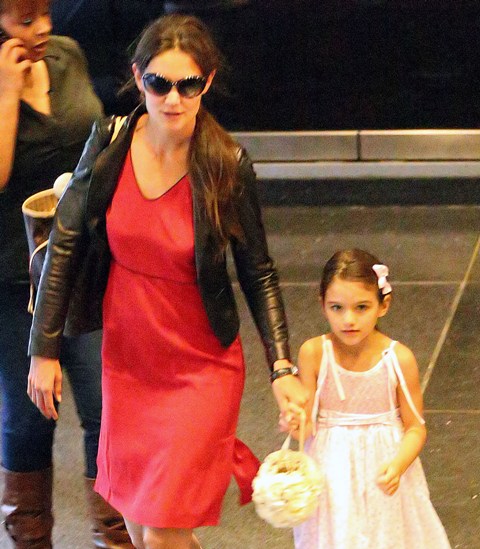 Here’s Katie with Suri on a bike the other day and going to see a show with her re-publicist Leslie Sloane with whom she got back together after breaking up with Tom Cruise. Suri is wearing Jeune Fille by Roger Vivier for kids. They retail for several hundred dollars. Proceeds from the children’s line will go to support several charities including New Yorkers For Children (click here).