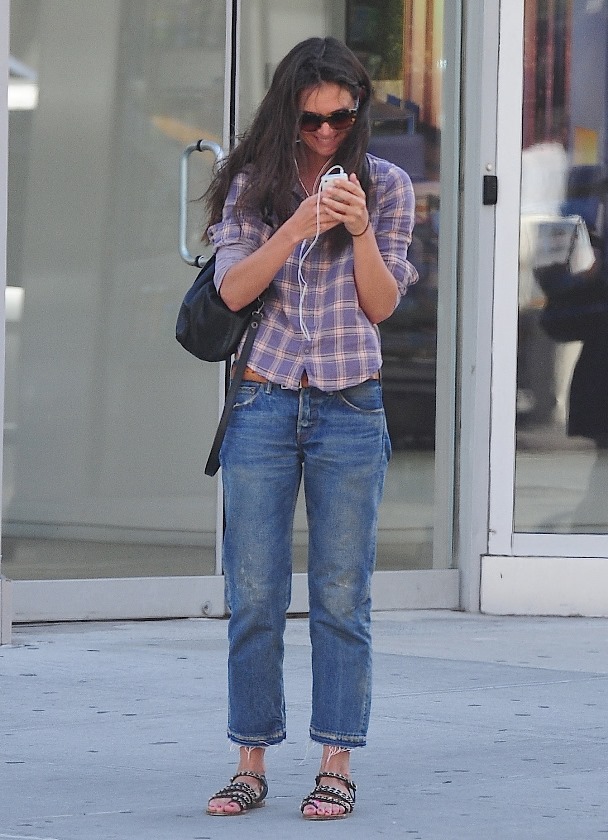 Katie’s been snapped in her natural habitat, which is walking around the streets of Chelsea with no adult companion in sight. Usually though, she’s sporting one of two possible expressions – Lorazepam Zen or Suri Observation Protocol. Right now though, she looks happy. Like REALLY happy.