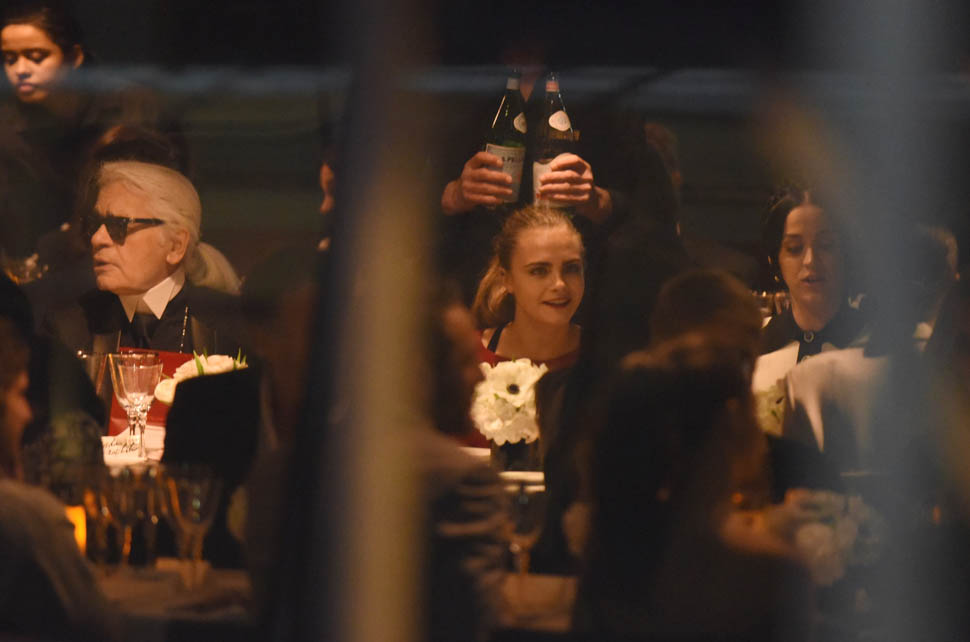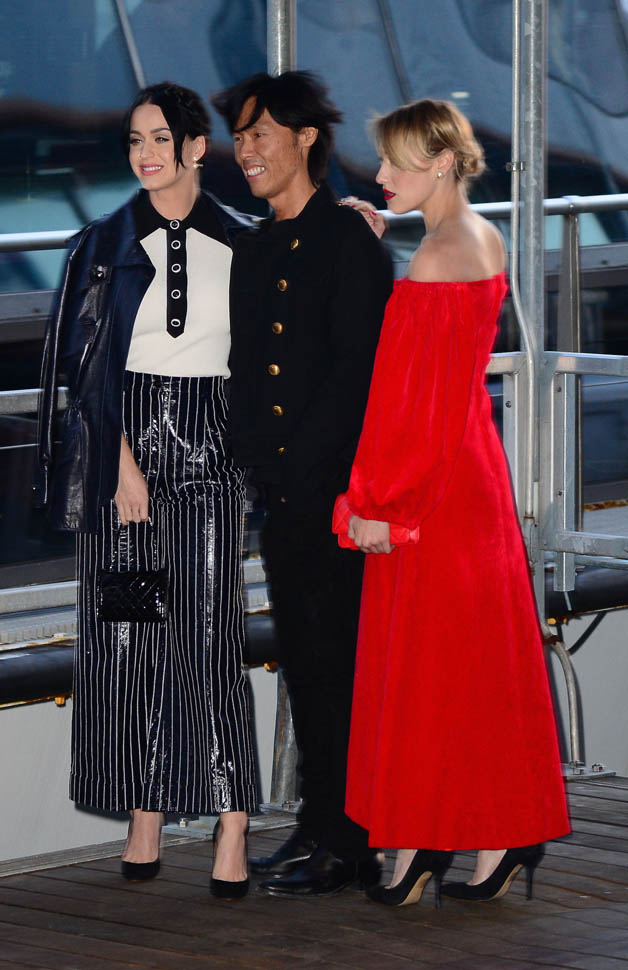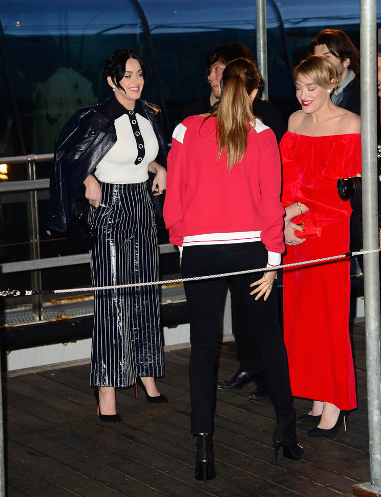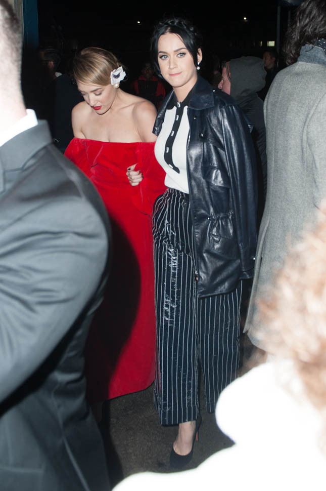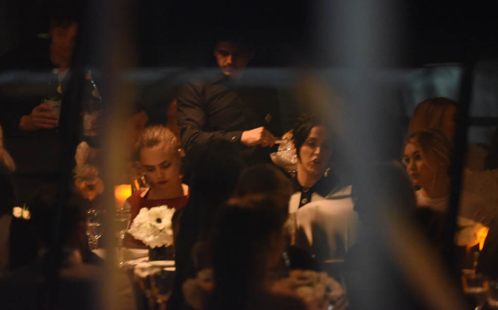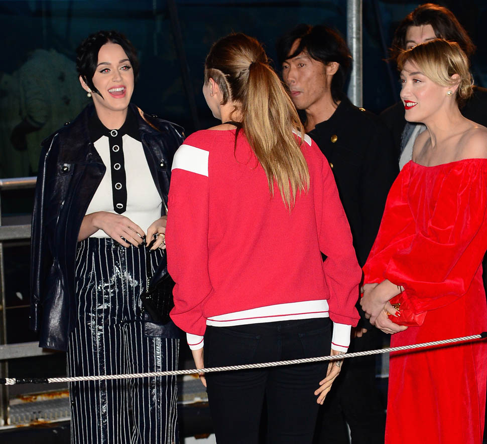Last night she stepped out for a Chanel party with Karl Lagerfeld. It was a Hudson River cruise. Katy was with her good friend Mia Moretti. And she was hanging out with Dakota Johnson and Cara Delevingne and some people who are related to Kanye West’s wife. Including Kanye West’s wife’s mother. And that’s interesting because, as you know, some of these people also hang with Taylor Swift who’s been meticulously colonising friends, kinda like she’s England and Katy’s France. It’s the Third Hundred Years’ War. (Amazing the sh-t you retain from Grade 7 History.)
