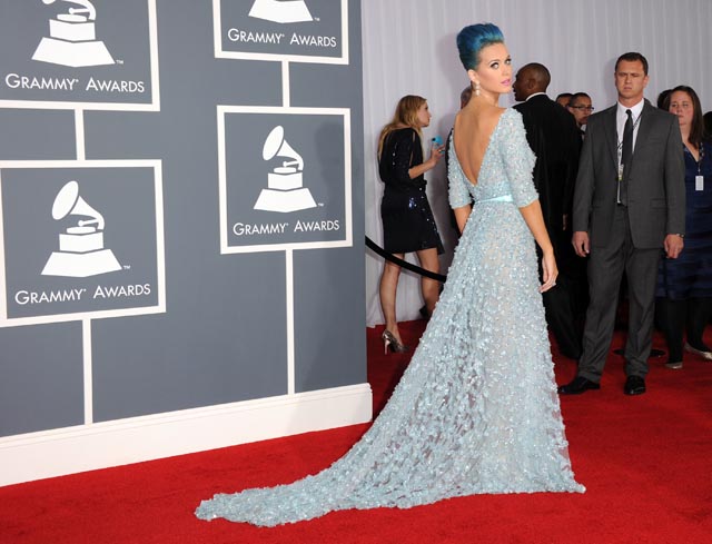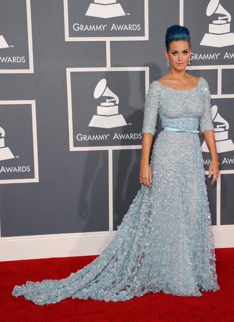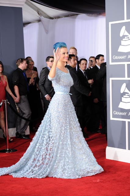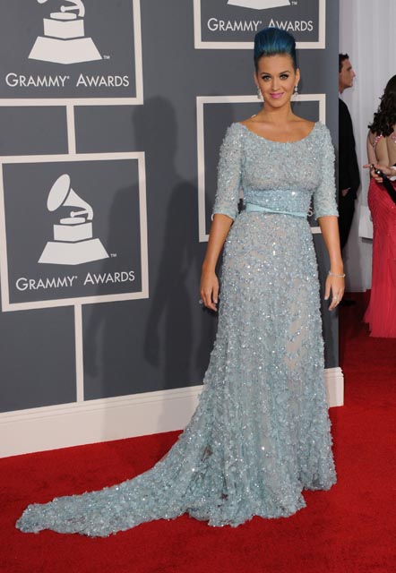 What an awful dress. Really, with everything available to you, you choose this? What does this say about what you want to do with your Grammy night? Katy Perry never chooses a dress by accident so she must want this to do something. Some sort of Betty Draper In Repose type thing, with the bouffant? I don’t know.
