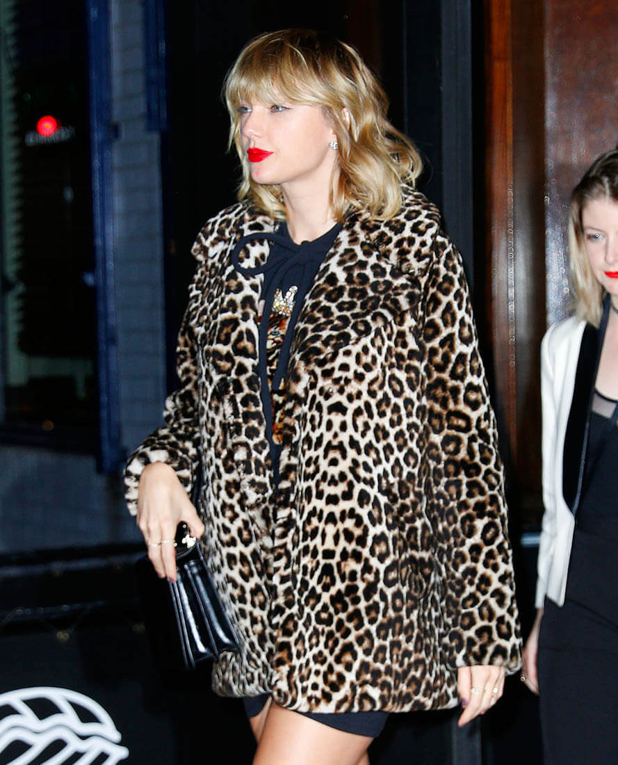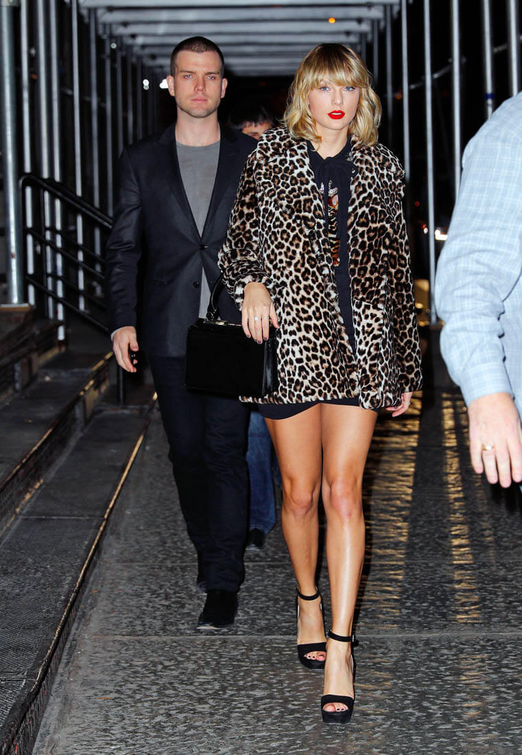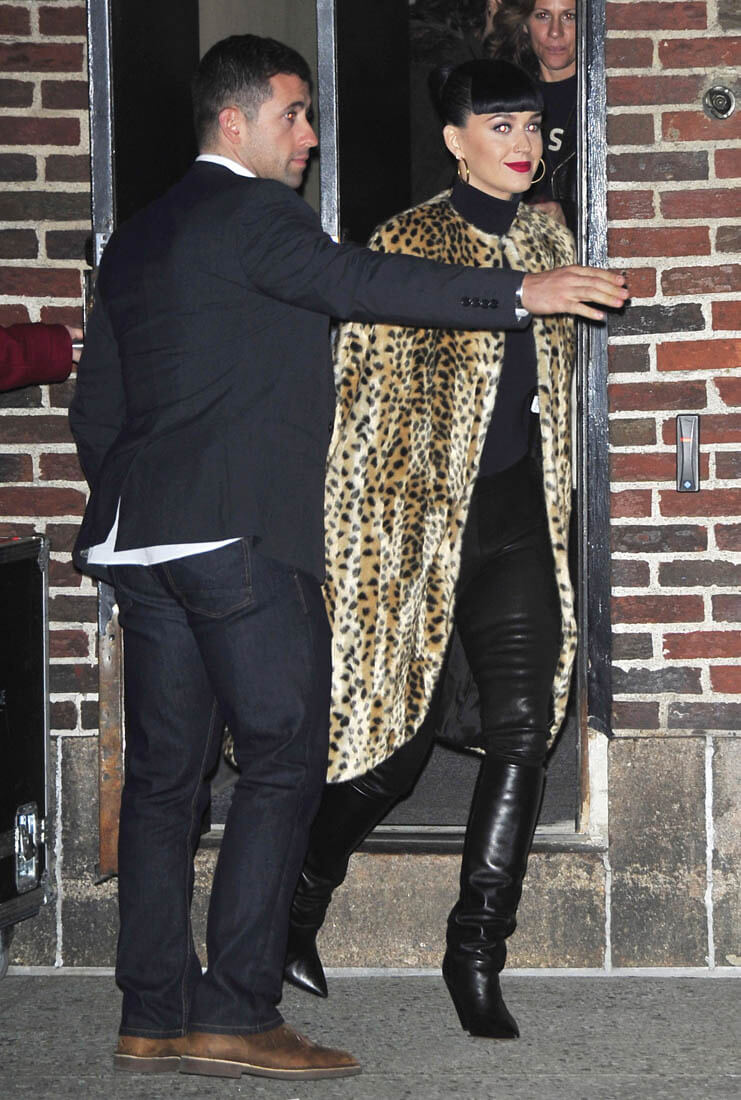 Katy Perry was in New York last night at Stephen Colbert, seen here in a leopard print coat. Or cheetah. Like I’ve said before, I can never remember or distinguish animal prints. Katy’s been campaigning hard for Hillary Clinton and her visit to Colbert was to “talk politics”. Meanwhile, also in New York, Taylor Swift stepped out in a similar coat to celebrate Lorde’s 20th birthday. Coincidence or conspiracy?