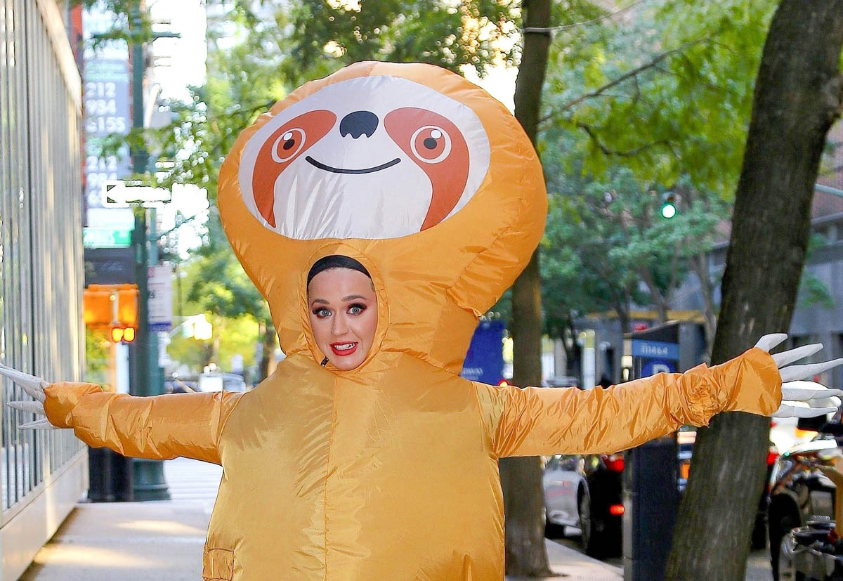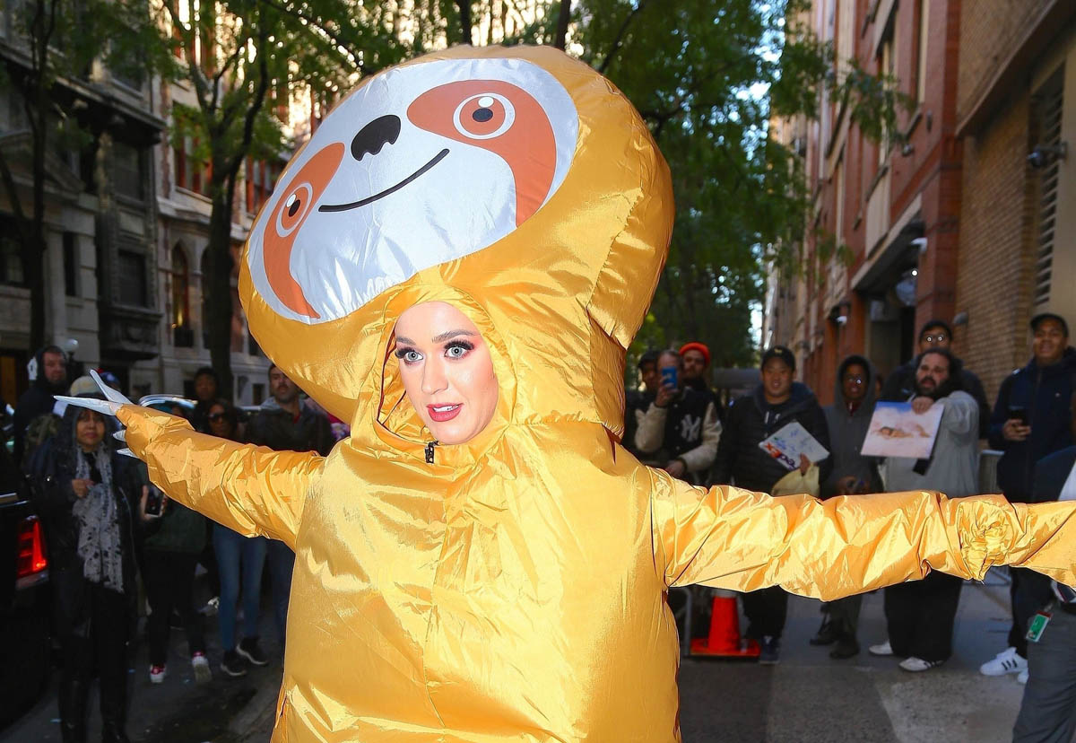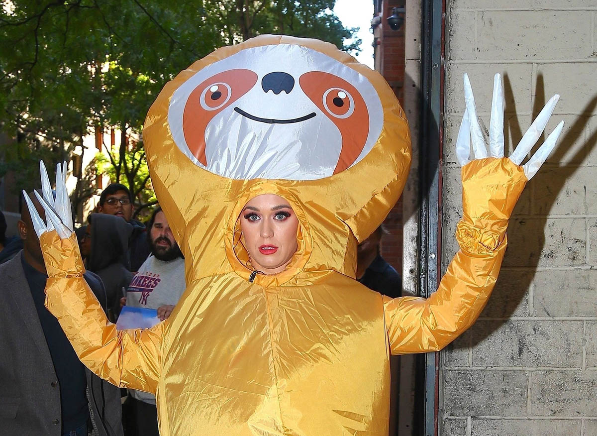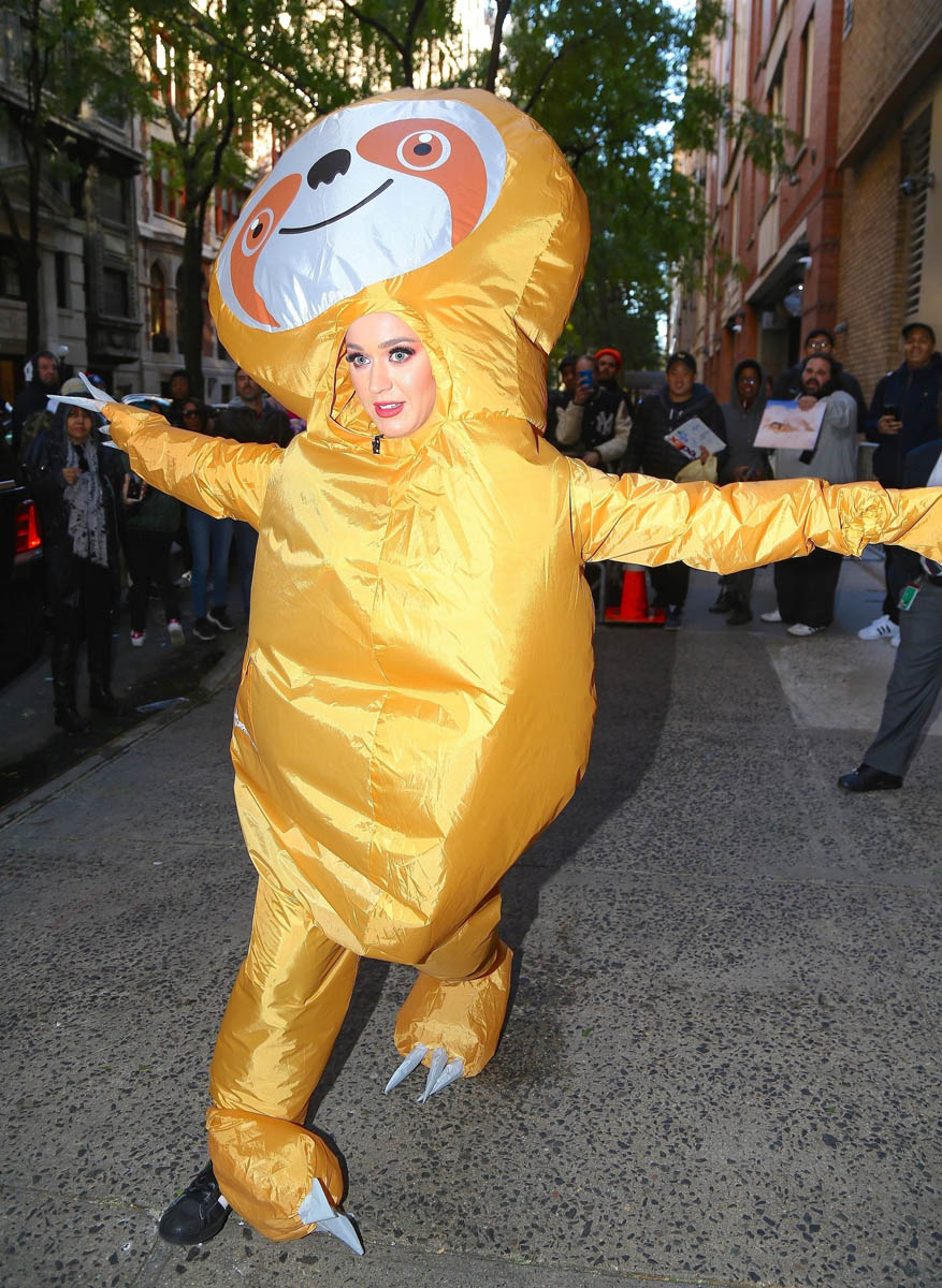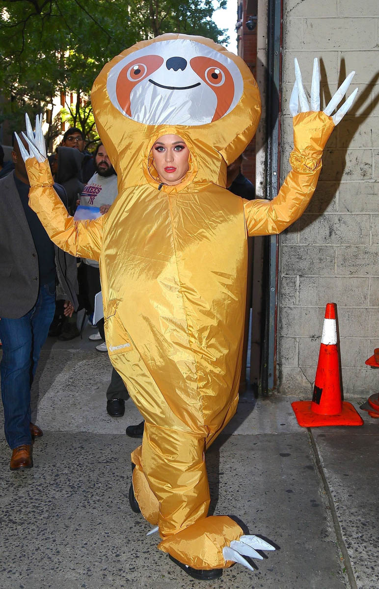 Here’s Katy Perry in New York today dressed as a sloth on her way to LIVE with Kelly and Ryan. You know how certain popstars have claimed certain holidays? Like for Taylor Swift, it’s the Fourth of July, or at least it used to be. And of course Christmas belongs to Mariah Carey. Kate Hudson has a Halloween party every year but I don’t think she owns the spirit of Halloween. Plus she’s not a popstar. To me, the perfect popstar for Halloween is Katy Perry. Think about it. Katy Perry’s style is caricature. Her clothes always look like they’ve been cartooned. Everything she wears, even when it’s not a costume, looks like a Halloween costume, not only in the colours and the shapes but also in the quality. Halloween costumes are never high quality – the stitching looks like it’ll barely hold together, the whole point is that it’s temporary and therefore not worth the time to put the quality into. That’s how Katy Perry dresses! She is Halloween! Her Super Bowl halftime show was Halloween! Like I saw these photos of her at on the agency database and almost skipped over them because they seemed so normal to me. There’s Katy, looking exactly the way Katy does all the time.