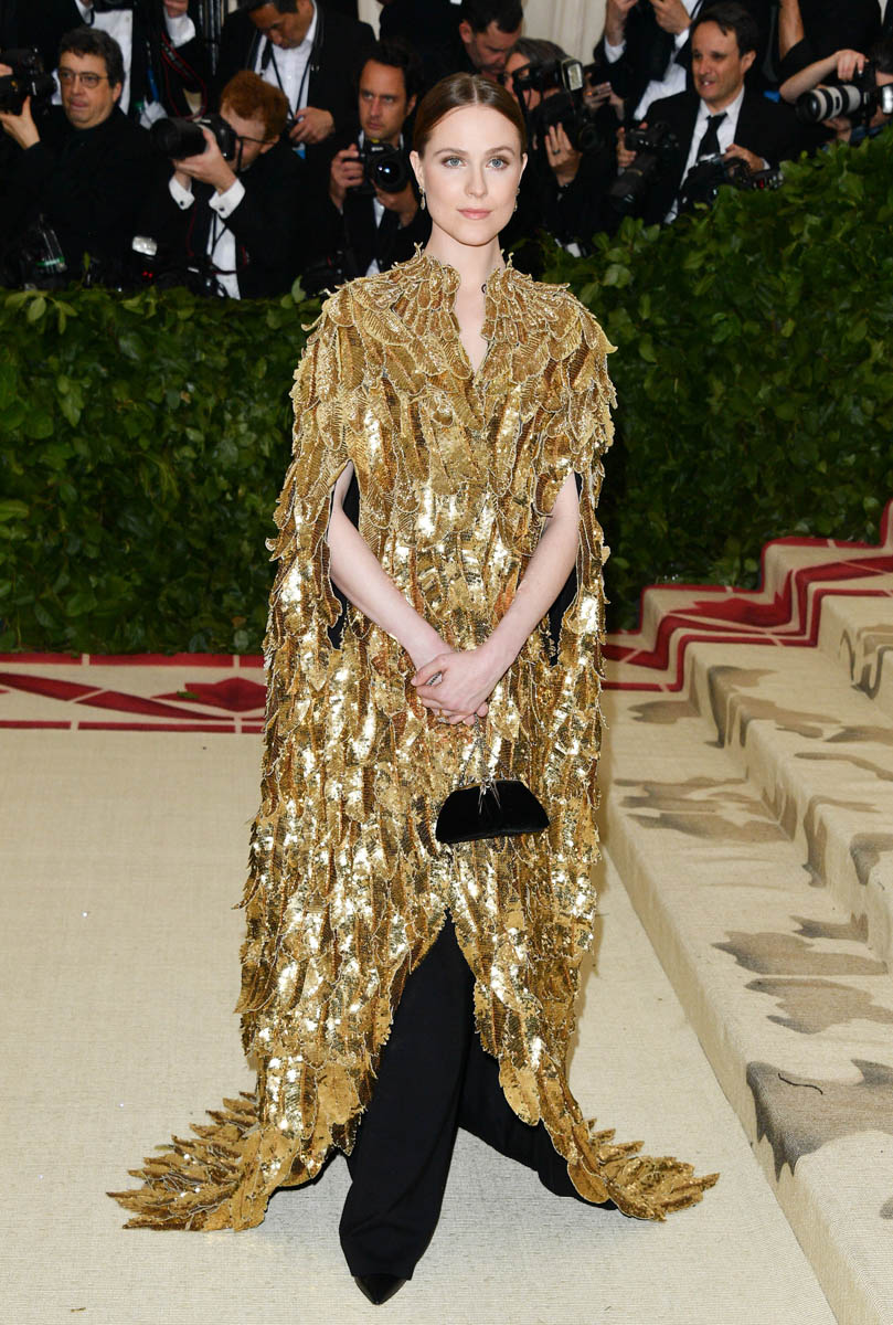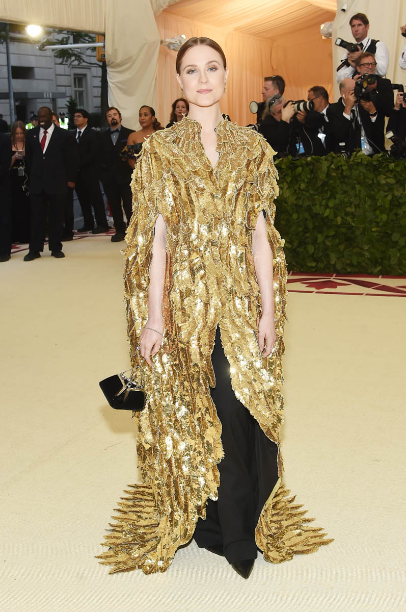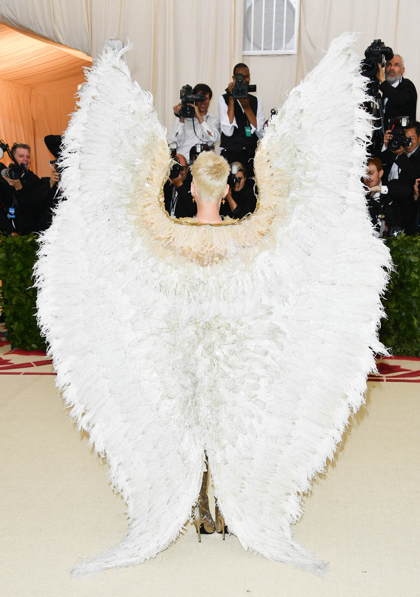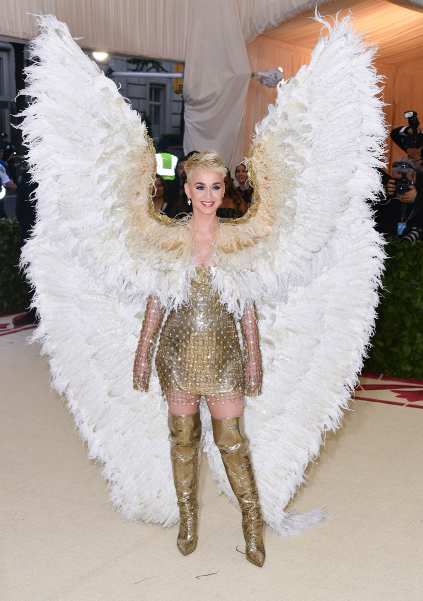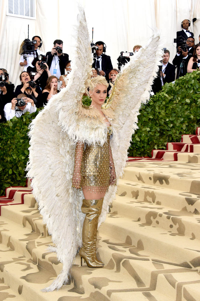 Katy Perry and Evan Rachel Wood weren’t the only feathered angels last night. But they were the only ones I remember. Katy Perry is the most obvious angel, as befits Katy Perry. It’s not like Katy ever does anything subtly. So, of course, her angel wings are going to take up the sky, spread up and out in spectacle. This is the angel you were expecting with the theme of the Met Gala this year, “Heavenly Bodies: Fashion and the Catholic Imagination”. She is the stunt angel. She is the one who stunts, year after year. You a need stunt here though, don’t you? What if we had gone the whole night without someone showing up in jacked up wings? I would have been disappointed. So the job was always Katy Perry’s to begin with. And she did it well. I would wear the chain mail dress with the extra-long sleeves that nobody really bothered to notice under her wings. I wouldn’t wear the over-the-thigh gold boots but they’re the right choice for the look. Also she went back to platinum blonde for the occasion because lately her hair has been kinda purple, which would have been a major takeaway from the overall illusion.