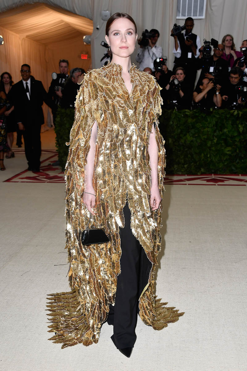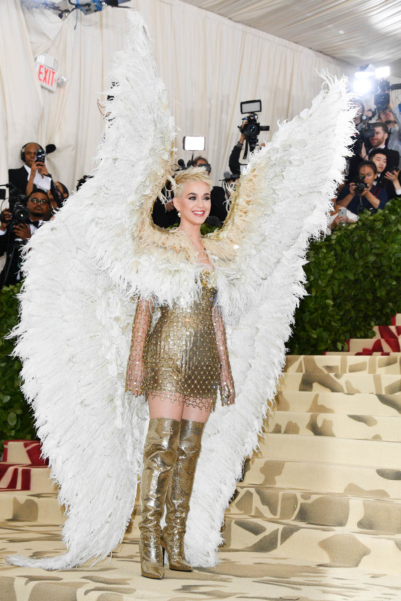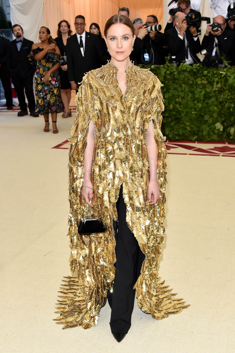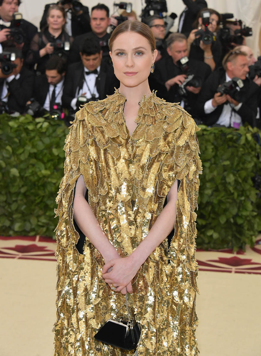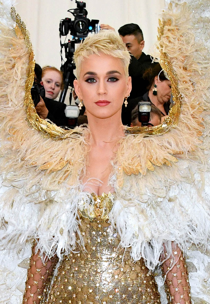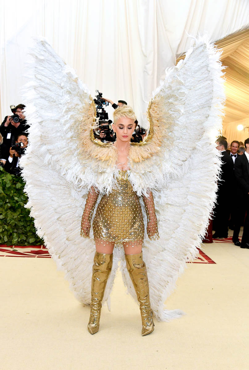 Katy Perry and Evan Rachel Wood weren’t the only feathered angels last night. But they were the only ones I remember. Katy Perry is the most obvious angel, as befits Katy Perry. It’s not like Katy ever does anything subtly. So, of course, her angel wings are going to take up the sky, spread up and out in spectacle. This is the angel you were expecting with the theme of the Met Gala this year, “Heavenly Bodies: Fashion and the Catholic Imagination”. She is the stunt angel. She is the one who stunts, year after year. You a need stunt here though, don’t you? What if we had gone the whole night without someone showing up in jacked up wings? I would have been disappointed. So the job was always Katy Perry’s to begin with. And she did it well. I would wear the chain mail dress with the extra-long sleeves that nobody really bothered to notice under her wings. I wouldn’t wear the over-the-thigh gold boots but they’re the right choice for the look. Also she went back to platinum blonde for the occasion because lately her hair has been kinda purple, which would have been a major takeaway from the overall illusion.