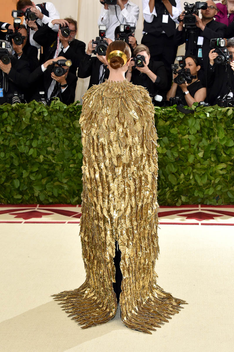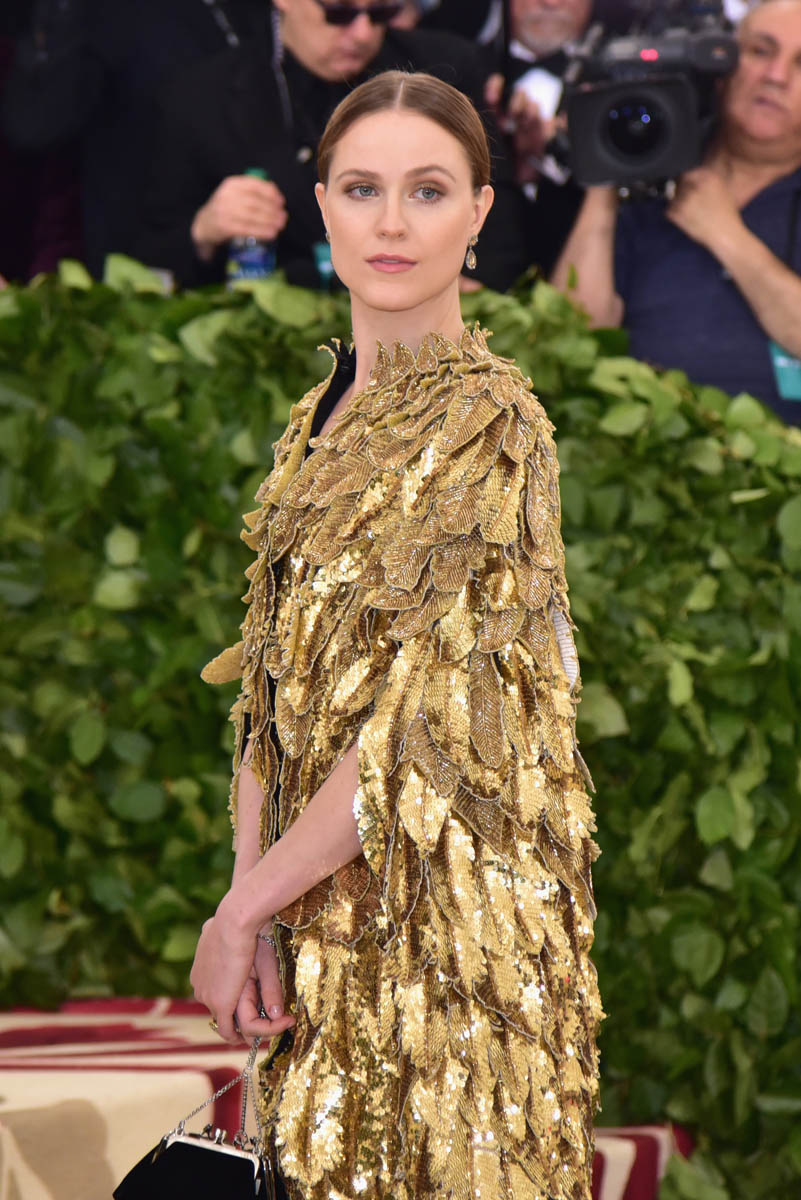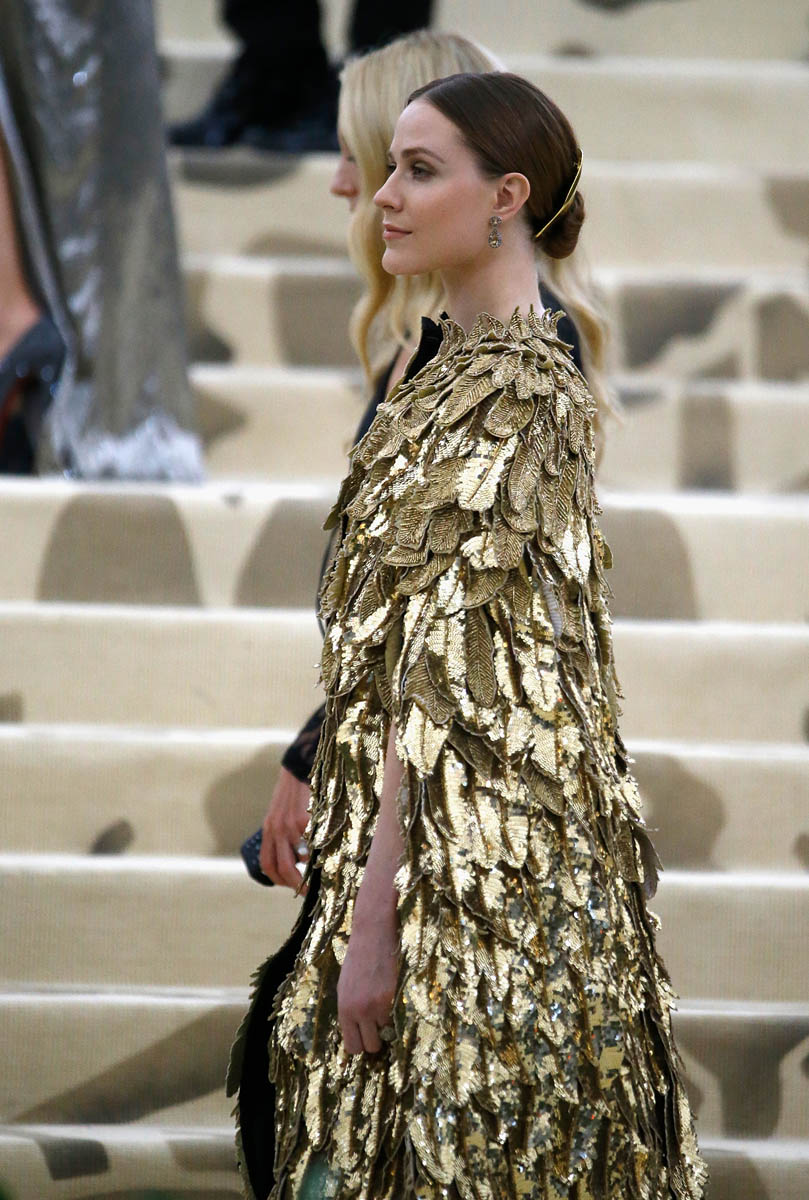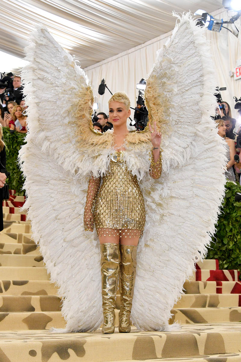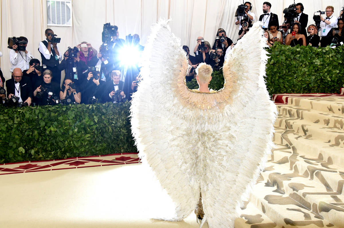 Katy Perry and Evan Rachel Wood weren’t the only feathered angels last night. But they were the only ones I remember. Katy Perry is the most obvious angel, as befits Katy Perry. It’s not like Katy ever does anything subtly. So, of course, her angel wings are going to take up the sky, spread up and out in spectacle. This is the angel you were expecting with the theme of the Met Gala this year, “Heavenly Bodies: Fashion and the Catholic Imagination”. She is the stunt angel. She is the one who stunts, year after year. You a need stunt here though, don’t you? What if we had gone the whole night without someone showing up in jacked up wings? I would have been disappointed. So the job was always Katy Perry’s to begin with. And she did it well. I would wear the chain mail dress with the extra-long sleeves that nobody really bothered to notice under her wings. I wouldn’t wear the over-the-thigh gold boots but they’re the right choice for the look. Also she went back to platinum blonde for the occasion because lately her hair has been kinda purple, which would have been a major takeaway from the overall illusion.