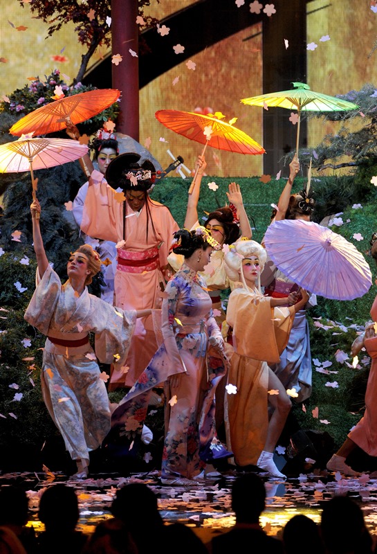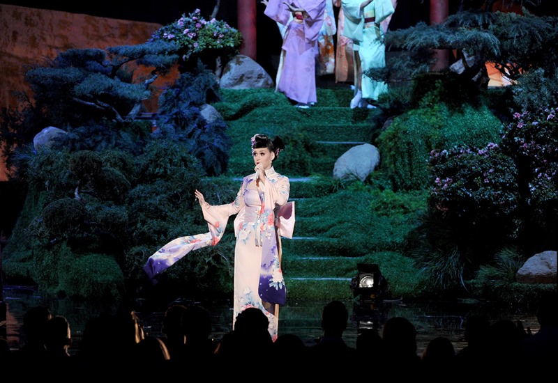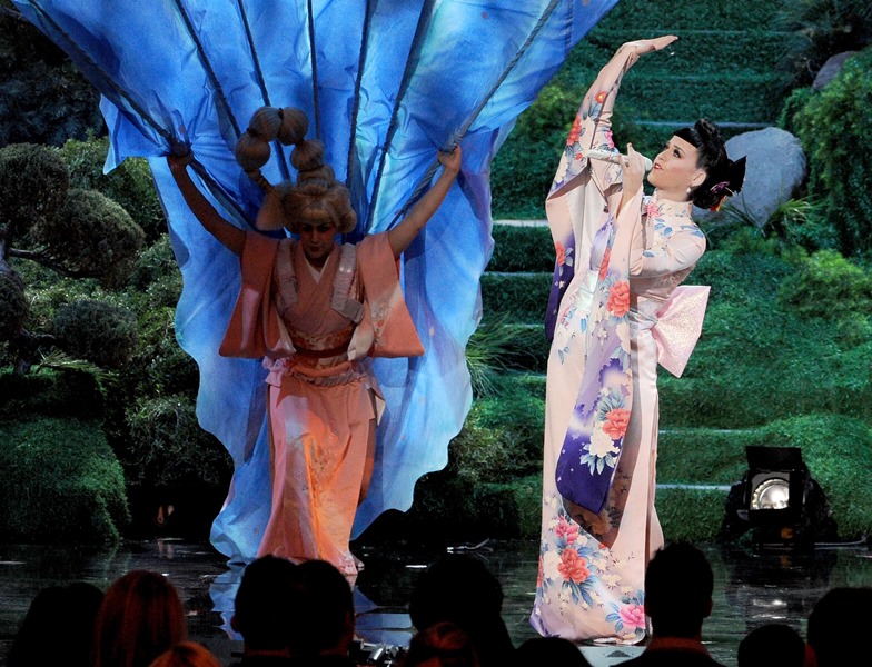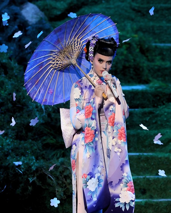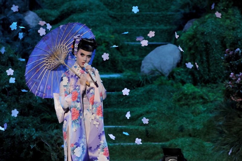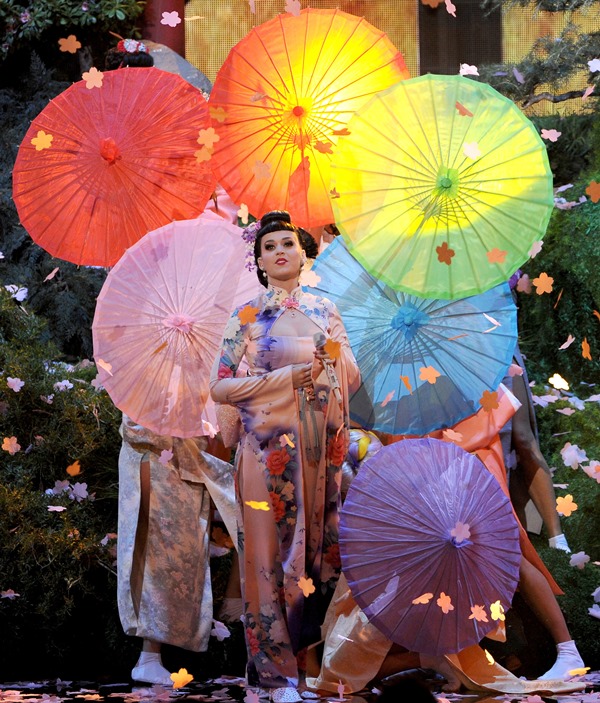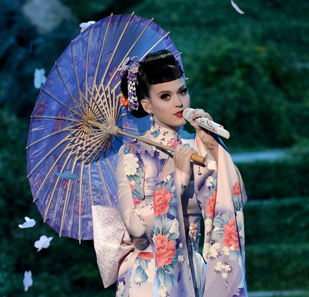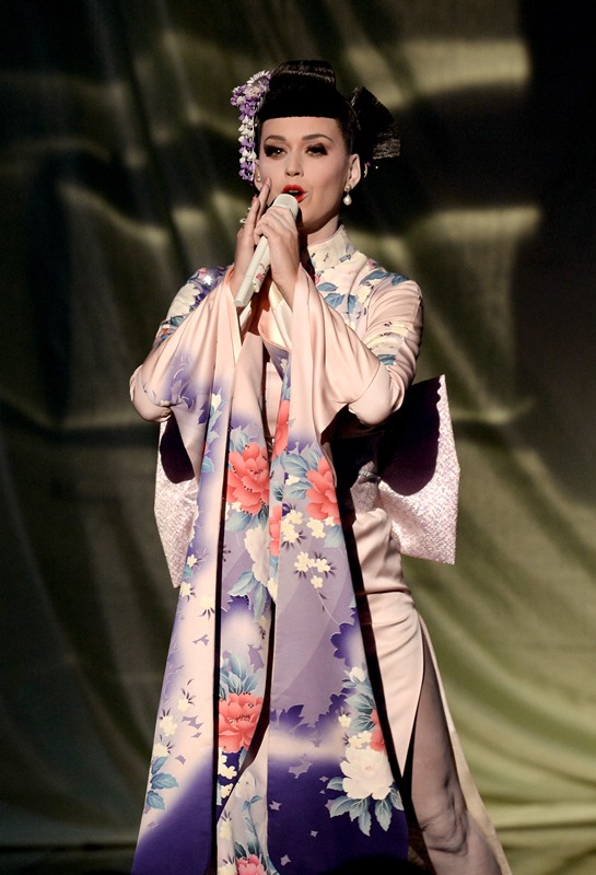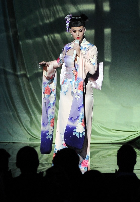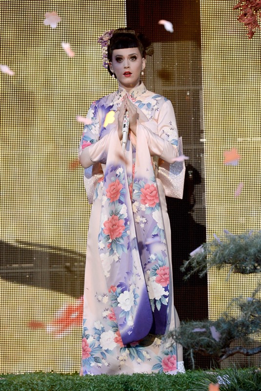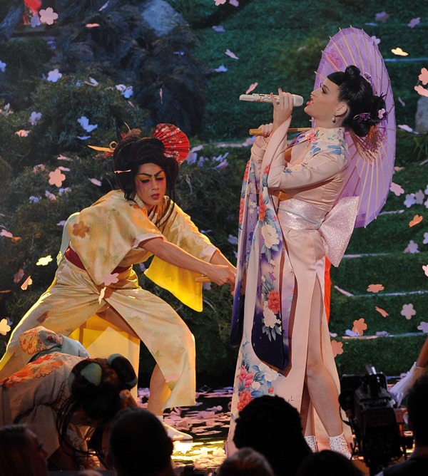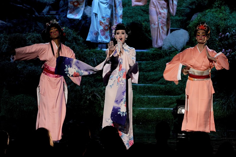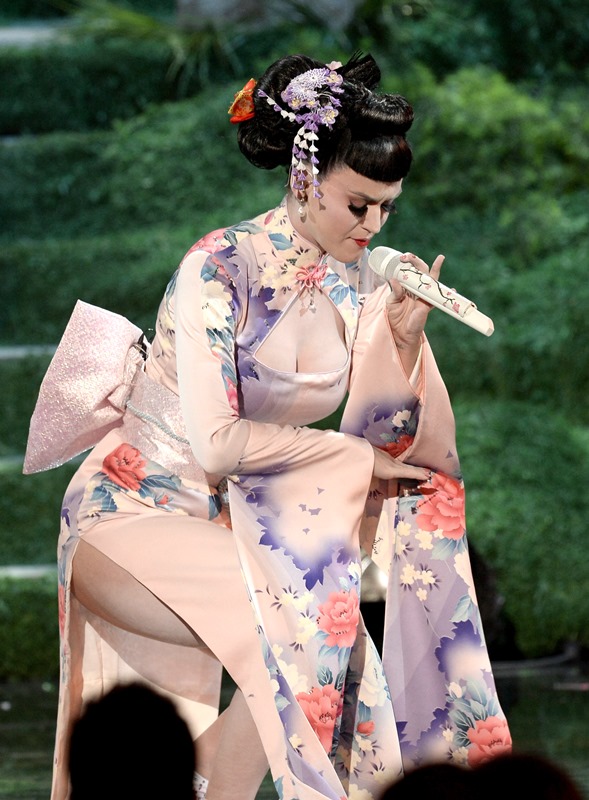 It’s called Cultural Appropriation. The gaping hole in her costume so that her breasts would be visible? That pretty much is what Cultural Appropriation looks like. Or, you could say it’s fetishisation. To better illustrate the point, watch Perry (singing terribly, by the way) at the AMAs last night – video below – and and then click here to listen to her “obsess” about the Japanese on Kimmel last year. Back to back. View them back to back and let the grossness punch you in the face.